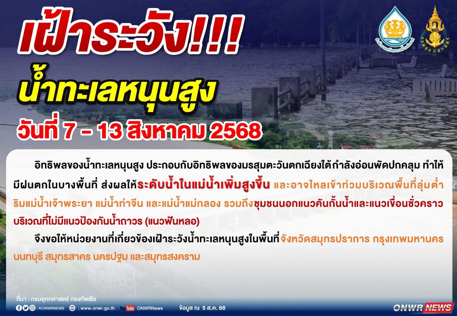 ด้วยสำนักงานทรัพยากรน้ำแห่งชาติ (สทนช.) ได้ติดตามสถานการณ์น้ำทะเลหนุนสูงบริเวณแม่น้ำเจ้าพระยาจากกรมอุทกศาสตร์ โดยคาดหมายระดับน้ำบริเวณป้อมพระจุลจอมเกล้า และพื้นที่ใกล้เคียง ในระหว่างวันที่ 7 - 13 สิงหาคม 2568 เวลาประมาณ 18.00 - 21.00 น. เป็นช่วงที่ระดับน้ำทะเลหนุนสูง โดยคาดหมายระดับน้ำบริเวณป้อมพระจุลจอมเกล้า และพื้นที่ใกล้เคียงอาจมีความสูงประมาณ 1.70 – 2.00 เมตร จากระดับทะเลปานกลาง ซึ่งสูงกว่าระดับน้ำวิกฤติประมาณ 0.30 เมตร ประกอบกับอิทธิพลของมรสุมตะวันตกเฉียงใต้กำลังอ่อนพัดปกคลุม ทำให้มีฝนตกในบางพื้นที่ ส่งผลให้ระดับน้ำในแม่น้ำจะเพิ่มสูงขึ้น เกิดน้ำเอ่อล้นเข้าท่วม เนื่องจากน้ำทะเลหนุน บริเวณพื้นที่ลุ่มต่ำริมแม่น้ำเจ้าพระยา แม่น้ำท่าจีน และแม่น้ำแม่กลอง รวมถึงชุมชนนอกแนวคันกั้นน้ำ และแนวเขื่อนชั่วคราวบริเวณที่ไม่มีแนวป้องกันน้ำถาวร (แนวฟันหลอ) บริเวณจังหวัดสมุทรปราการ กรุงเทพมหานคร นนทบุรี สมุทรสาคร นครปฐม และสมุทรสงคราม นั้น