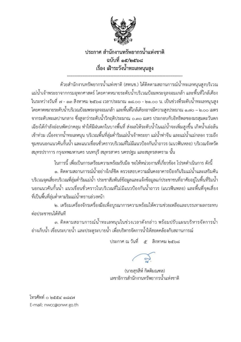 สำนักงานทรัพยากรน้ำแห่งชาติ ประกาศฉบับที่ 15/2568 เรื่อง เฝ้าระวังน้ำทะเลหนุนสูง วันที่ 7 - 13 สิงหาคม 2568