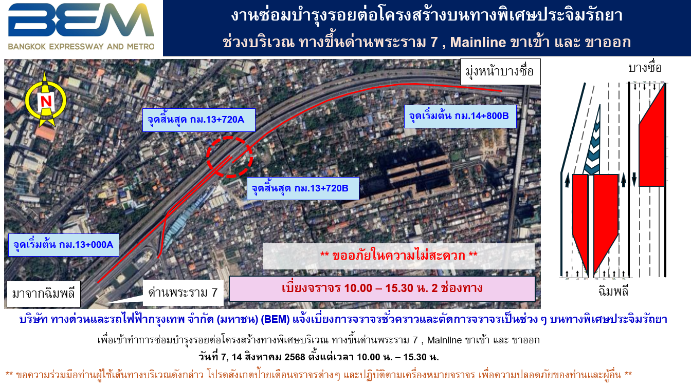 บริษัท ทางด่วนและรถไฟฟ้ากรุงเทพ จำกัด (มหาชน) หรือ BEM ประชาสัมพันธ์แจ้งเบี่ยงการจราจรทางพิเศษประจิมรัถยา ช่วงบริเวณ ทางขึ้นด่านสะพานพระราม 7 เนื่องจากมีความจำเป็นต้องบำรุงรักษารอยต่อโครงสร้าง เพื่อความปลอดภัยของผู้ใช้ทาง โดยผู้ใช้ทางยังสามารถสัญจรได้ตามปกติ