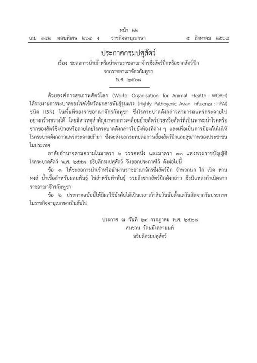 6 สิงหาคม 2568 ราชกิจจานุเบกษา เผยแพร่ ประกาศกรมปศุสัตว์ เรื่อง ชะลอการนำเข้าหรือนำผ่านราชอาณาจักรซึ่งสัตว์ปีกหรือซากสัตว์ปีก จากราชอาณาจักรกัมพูชา พ.ศ. 2568 โดยให้มีผลใช้บังคับเป็นเวลา 90 วันนับตั้งแต่วันที่ 6 สิงหาคม 2568 ซึ่งเป็นวันที่ประกาศในราชกิจจานุเบกษา