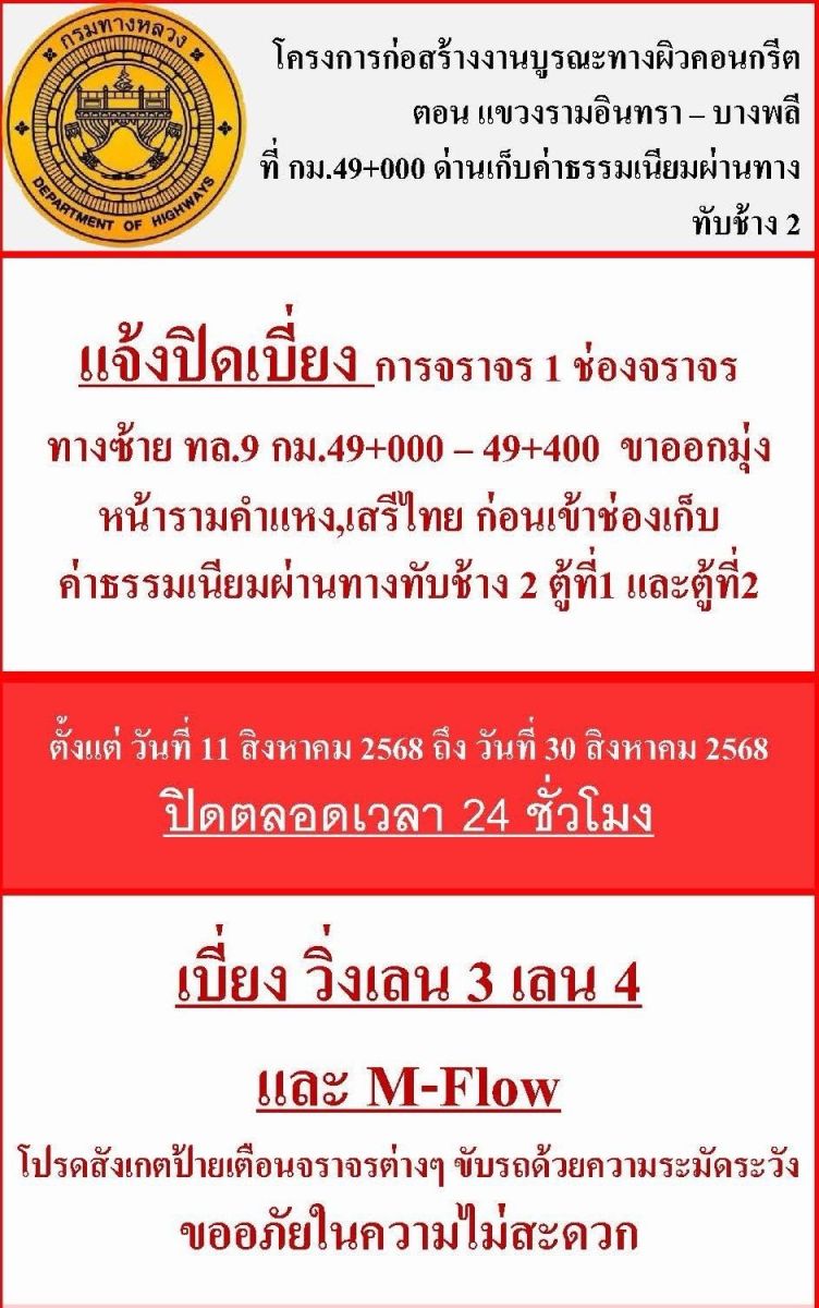 แจ้งปิดเบี่ยงจราจร ทางหลวงพิเศษหมายเลข 9 ขาออก มุ่งหน้า รามคำแหง-เสรีไทย กม.49+000 - กม.49+400 (ตลอด 24 ชั่วโมง)