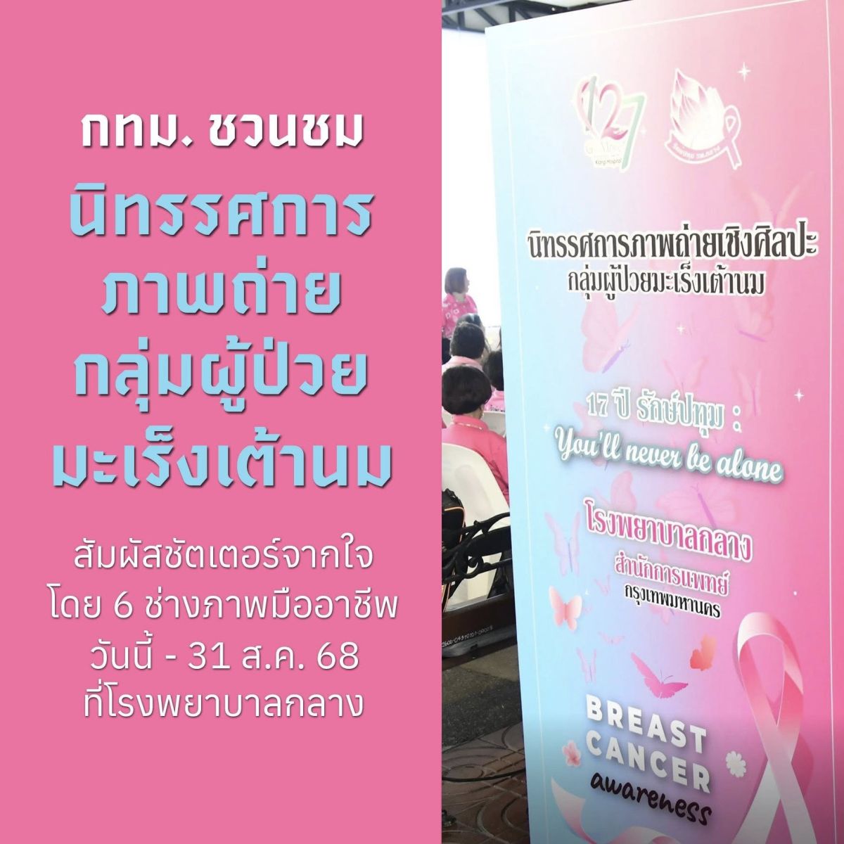 นิทรรศการภาพถ่ายเชิงศิลปะกลุ่มผู้ป่วยมะเร็งเต้านม จัดแสดงผลงานภาพถ่าย จาก 6 ช่างภาพมืออาชีพจากชมรมช่างภาพพระนคร จัดแสดงระหว่างวันที่ 6 - 31 ส.ค. 68 ณ บริเวณหน้าหน่วยแพทย์กู้ชีวิต ชั้น 1 โถงอาคารชั้น 1 - 3 และ ชั้น 11 นอกจากนี้ยังมีกิจกรรมการเสวนาในหัวข้อ " ทัศนศิลป์...ตื่นรู้... ทันมะเร็งเต้านม" และกิจกรรมอื่น ๆ อาทิ การสอนตรวจเต้านมด้วยตนเอง การตรวจคัดกรองมะเร็งเต้านมเบื้องต้น การแจกแผ่นทดสอบคลำเต้านม และเต้านมเทียม การแจกบัตรของขวัญการตรวจมะเร็งเต้านมด้วยเครื่องแมมโมแกรมและอัลตราซาวด์ การจำหน่ายสินค้าที่ระลึกจากกลุ่มรักษ์ปทุมรายได้หลังหักค่าใช้จ่ายมอบให้มูลนิธิโรงพยาบาลกลางเพื่อผู้ป่วยมะเร็งเต้านม