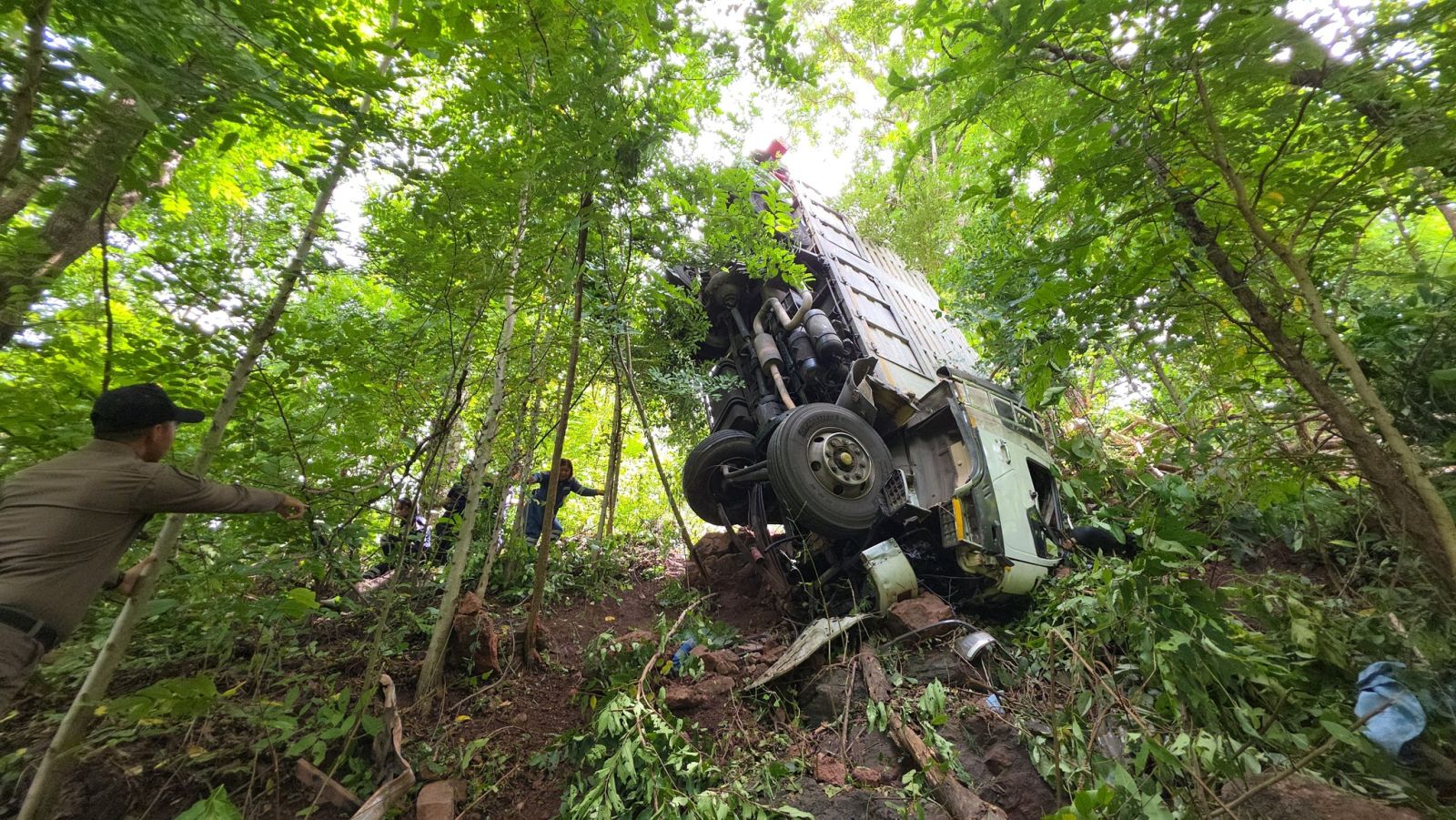 ต่อมาในช่วงสายของวันนี้ จึงได้ทำการสนธิกำลังเจ้าหน้าที่จากหลายหน่วยงานเข้าพื้นที่อีกครั้ง และสามารถเข้าตรวจสอบซากรถได้อย่างใกล้ชิด โดยจากการตรวจสอบพบรถบรรทุกพ่วงสภาพตกเหวหัวทิ่มอยู่ จึงต้องใช้รถเครนขนาดใหญ่จำนวน 2 คัน ใช้สายสลิงยึดรถพ่วงไว้ก่อน เพื่อให้เจ้าหน้าที่ได้ลงไปตรวจสอบซากรถเก๋ง ที่อยู่ลึกลงไป 20 เมตร เพราะเกรงว่าอาจจะเกิดอันตรายรถพ่วงอาจจะไหลงลงไปได้