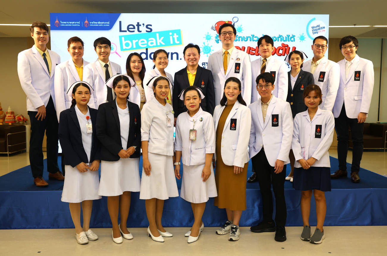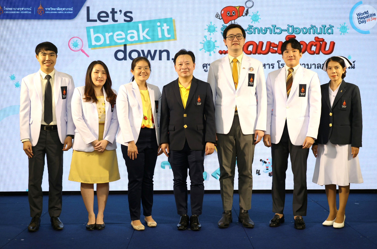 โรคตับอักเสบนับเป็นโรคที่ส่งผลกระทบต่อสุขภาพของผู้คนทั่วโลกรวมถึงประเทศไทย ซึ่งโรคนี้สามารถป้องกันและรักษาได้ หากได้รับการตรวจวินิจฉัยตั้งแต่เริ่มมีอาการ ดังนั้นทุกคนควรใส่ใจดูแลสุขภาพตับ เพื่อชีวิตที่ยืนยาวและสุขภาพดี ราชวิทยาลัยจุฬาภรณ์ ในฐานะที่เป็นสถาบันการศึกษาวิจัยและสถาบันการแพทย์ ซึ่งมีพันธกิจในด้านบริการวิชาการและวิชาชีพด้านสุขภาพแก่สังคม โดยมีโรงพยาบาลจุฬาภรณ์ เป็นส่วนงานหลักในการให้บริการรักษาพยาบาลแก่ประชาชน มุ่งส่งเสริมความรู้และการดูแลเชิงป้องกัน ทั้งนี้เพื่อกระตุ้นให้ทุกคนตระหนักถึงความสำคัญ จึงได้จัดกิจกรรม กิจกรรม Let’s break it down รู้เร็ว รักษาไว ป้องกันได้....ลดมะเร็งตับ และบริการวิชาการสุขภาพและบริการทางการแพทย์เนื่องในวันตับอักเสบโลก (World Hepatitis Day) ประจำปี 2568 เพื่อถวายเป็นพระกุศลแด่ ศาสตราจารย์ ดร. สมเด็จพระเจ้าน้องนางเธอ เจ้าฟ้าจุฬาภรณวลัยลักษณ์ อัครราชกุมารี กรมพระศรีสวางควัฒน วรขัตติยราชนารี ทรงเจริญพระชันษา 68 ปี วันที่ 4 กรกฎาคม 2568 โดยมี นพ.ดำรงค์ สุกิจปัญญาโรจน์ รองผู้อำนวยการโรงพยาบาลจุฬาภรณ์ เป็นประธานในพิธีเปิด พร้อมด้วย นพ.วรวัฒน์ แสงวิภาสนภาพร หัวหน้างานอายุรกรรมทางเดินอาหาร แพทย์เฉพาะทางด้านอายุรศาสตร์ทางเดินอาหารและตับ และทีมแพทย์เฉพาะทางด้านอายุรศาสตร์ทางเดินอาหารและตับ นำโดย พญ.กันต์สุดา ปัญจชัยพรพล พญ.อัญญา เกียรติวีระศักดิ์ นพ.สพล วิวัฒน์พัฒนกุล และ นพ.สพล เทพวิวัฒน์จิต พร้อมด้วย นพ.กฤต หมัดแสละ แพทย์เฉพาะทางเวชศาสตร์ป้องกัน แขนงเวชศาสตร์การเดินทางและท่องเที่ยว นพ.ธนกร เจริญธนดล แพทย์เฉพาะทางด้านอายุรศาสตร์มะเร็งวิทยา นพ.กฤตรัตน์ ชัยจิรวิวัฒน์ แพทย์เฉพาะทางสาขารังสีร่วมรักษาส่วนลำตัว พญ.ชัณษา บางยี่ขัน ศัลยแพทย์ตับ ตับอ่อน และทางเดินน้ำดี เข้าร่วมงาน ณ โถงชั้น 1 โซน บี อาคารกรมพระศรีสวางควัฒน โรงพยาบาลจุฬาภรณ์ วันศุกร์ที่ 8 สิงหาคม 2568