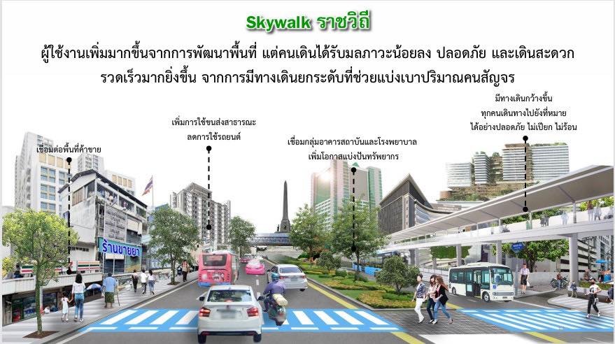 เมื่อโครงการแล้วเสร็จ สกายวอล์กจะสามารถใช้เป็นหลังคาบังแดดบังฝนให้กับผู้เดินเท้าได้ตลอดแนว ถือเป็นอีกหนึ่งความพยายามของ กทม. ในการผลักดันให้กรุงเทพฯ เป็น “เมืองเดินได้ เดินดี และน่าเดิน” อย่างแท้จริง