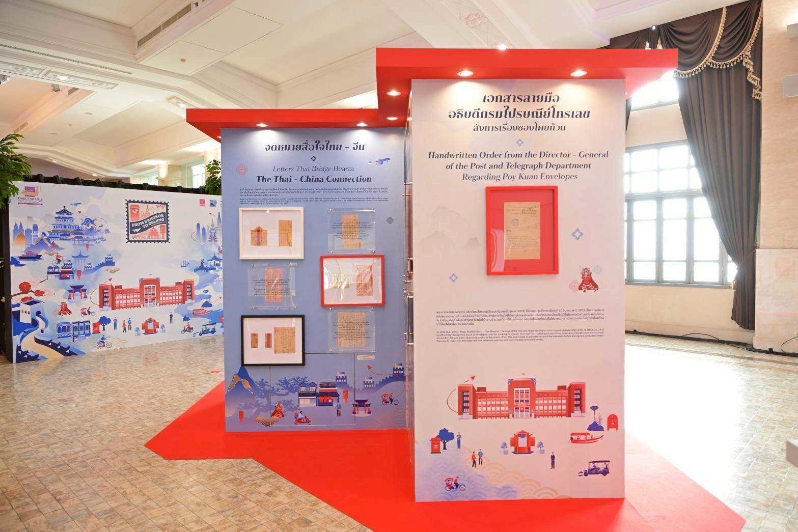 ฝั่งจีนจัดแสดงแสตมป์ “30 ปี ความสัมพันธ์ทางการทูตไทย–จีน ปี 2548” ที่บันทึกภาพคู่หมีแพนด้าช่วงช่วงและหลินฮุ่ย อันเป็นสัญลักษณ์ของมิตรภาพและการอนุรักษ์สัตว์ป่า และแสตมป์ “The Great Wall” ปี 2016 ภาพพาโนรามากำแพงเมืองจีน หนึ่งใน 7 สิ่งมหัศจรรย์ของโลกและมรดกโลกยูเนสโก โดดเด่นด้วยความยิ่งใหญ่และงามสง่า