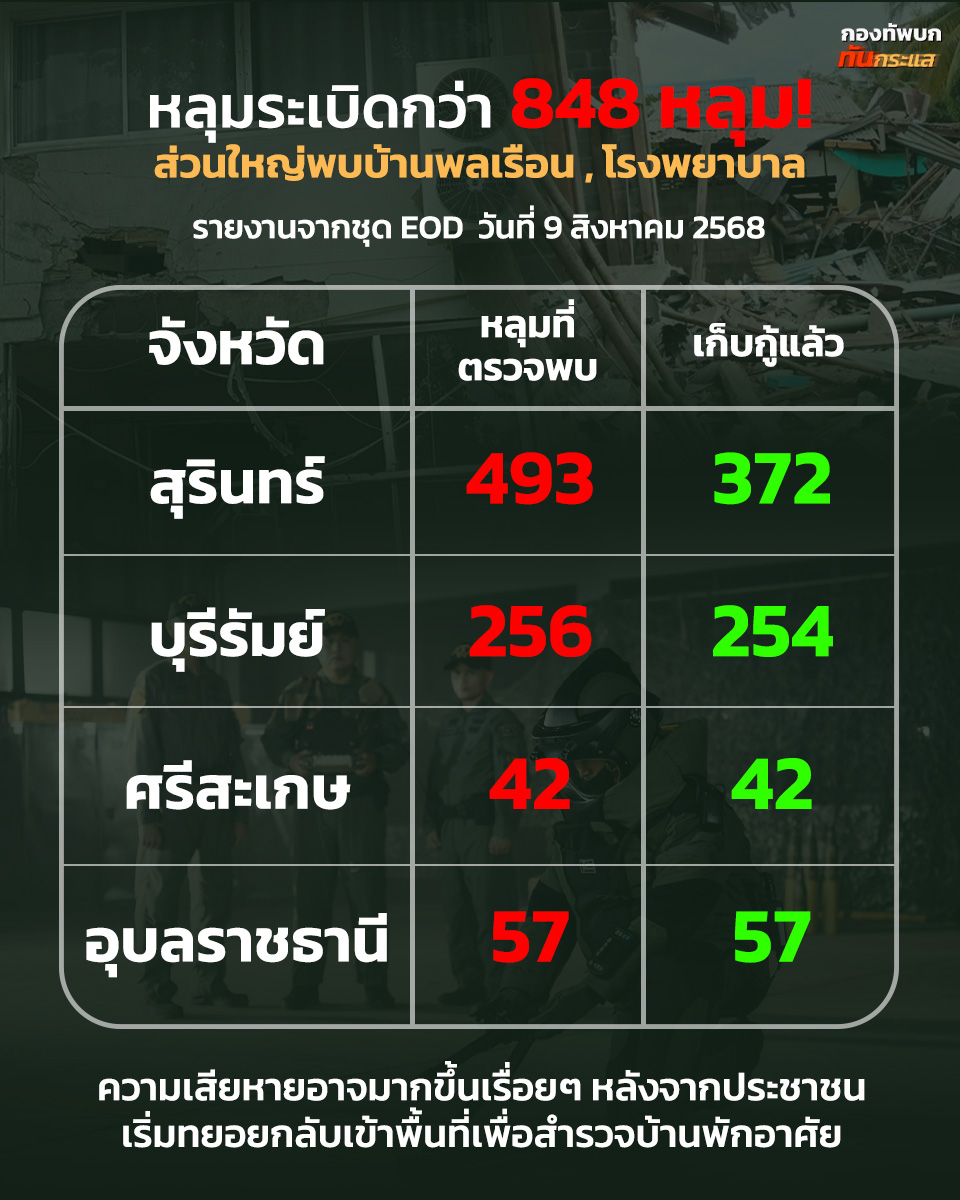 วันที่ 10 สิงหาคม 2568 เพจกองทัพบก ทันกระแส เผยเจ้าหน้าที่ชุด EOD พบหลุมระเบิดกว่า 794 หลุม ส่วนใหญ่พบบ้านพลเรือน , โรงพยาบาล ความเสียหายอาจมากขึ้นเรื่อยๆ หลังจากประชาชนเริ่มทยอยกลับเข้าพื้นที่เพื่อสำรวจบ้านพักอาศัย