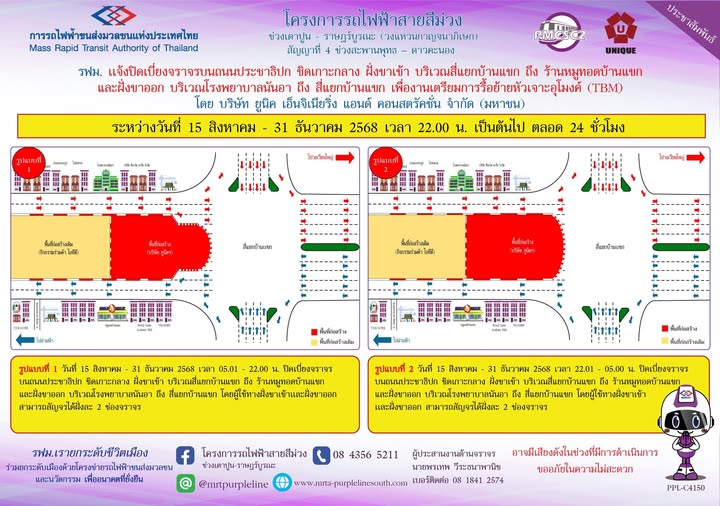 การรถไฟฟ้าขนส่งมวลชนแห่งประเทศไทย (รฟม.) แจ้งว่า บริษัท ยูนิค เอ็นจิเนียริ่ง แอนด์ คอนสตรัคชั่น จำกัด (มหาชน) ผู้รับจ้างงานออกแบบและก่อสร้างอุโมงค์ทางวิ่งและสถานีใต้ดิน โครงการรถไฟฟ้าสายสีม่วง ช่วงเตาปูน - ราษฎร์บูรณะ (วงแหวนกาญจนาภิเษก) สัญญาที่ 4 ช่วงสะพานพุทธ - ดาวคะนอง มีความจำเป็นต้องปิดเบี่ยงจราจรบนถนนประชาธิปก ชิดเกาะกลาง ฝั่งขาเข้า บริเวณสี่แยกบ้านแขก ถึง ร้านหมูทอดบ้านแขก และฝั่งขาออก บริเวณโรงพยาบาลนันอา ถึง สี่แยกบ้านแขก เพื่องานเตรียมการรื้อย้ายหัวเจาะอุโมงค์ (TBM) ระหว่างวันที่ 15 สิงหาคม - 31 ธันวาคม 2568 เวลา 22.00 น. เป็นต้นไป ตลอด 24 ชั่วโมง โดยมีการจัดการจราจร 2 รูปแบบ ดังนี้