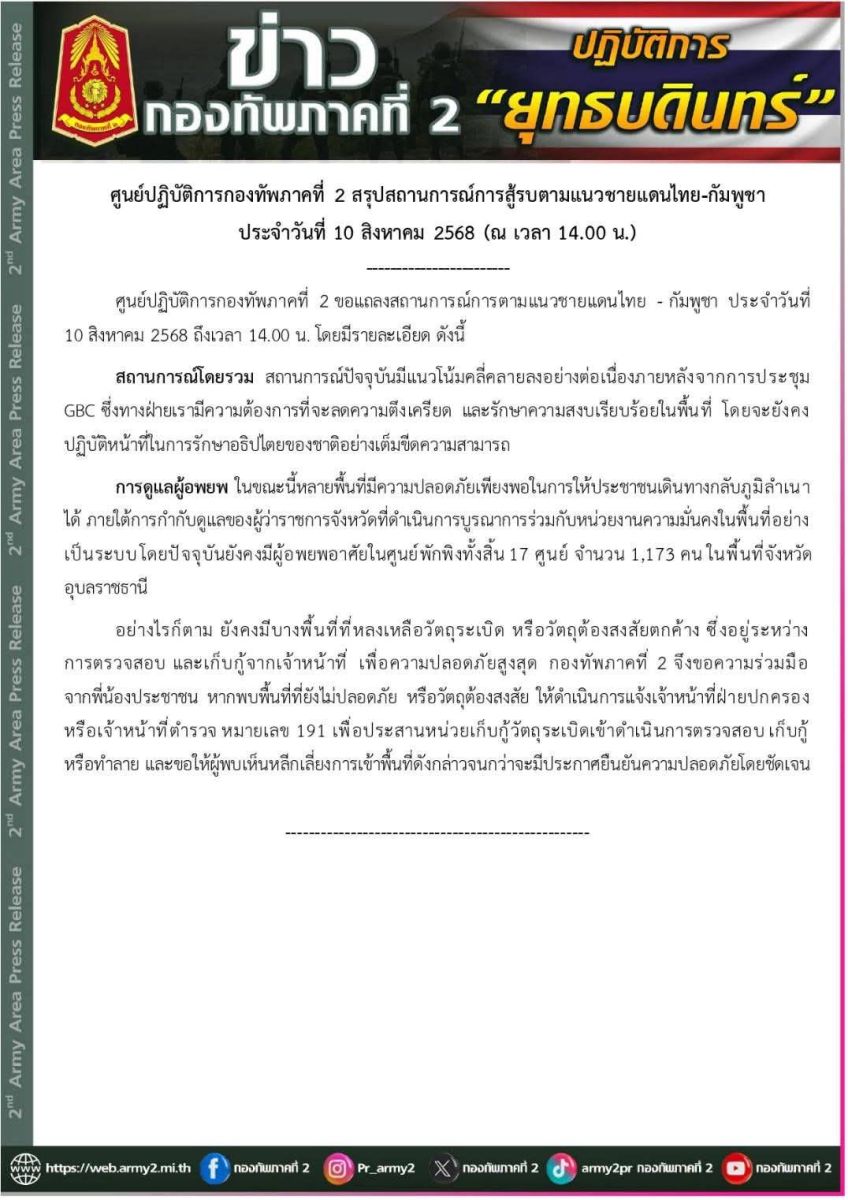 ศูนย์ปฏิบัติการกองทัพภาคที่ 2 ขอแถลงสถานการณ์การตามแนวชายแดนไทย - กัมพูชา ประจำวันที่ 10 สิงหาคม 2568 ถึงเวลา 14.00 น. โดยมีรายละเอียด ดังนี้