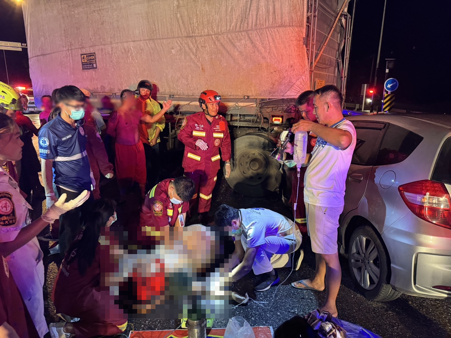 ที่เกิดเหตุ พบรถนั่งส่วนบุคคล ฮอนด้า แจ๊ส สีเทา แผ่นป้ายทะเบียน 3911 สุโขทัย ลักษณะกับรถพ่วง ตรวจสอบพบว่า มีผู้ได้รับบาดเจ็บ ชาย 1 ราย หมดสติ ติดค้างภายในยานพาหนะ เจ้าหน้าที่เร่งใช้เครื่องอุปกรณ์ ตัด-ถ่างงัดรถ เพื่อนำตัวผู้ได้รับบาดเจ็บออกมา ก่อนส่งต่อให้รถกู้ชีพโรงพยาบาลวัดโบสถ์นำส่งโรงพยาบาลวัดโบสถ์ เพื่อรักษาต่อไป