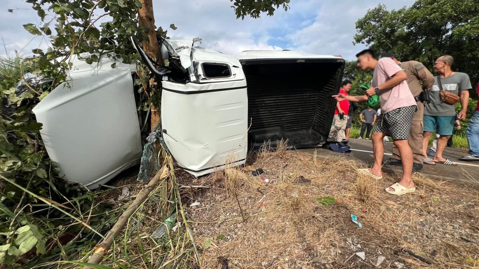 รถกระบะเสียหลักพลิกตะแคง ไถลชนต้นไม้พังยับ คนขับเจ็บติดอยู่ภายในยานพาหนะ จ.ตราด