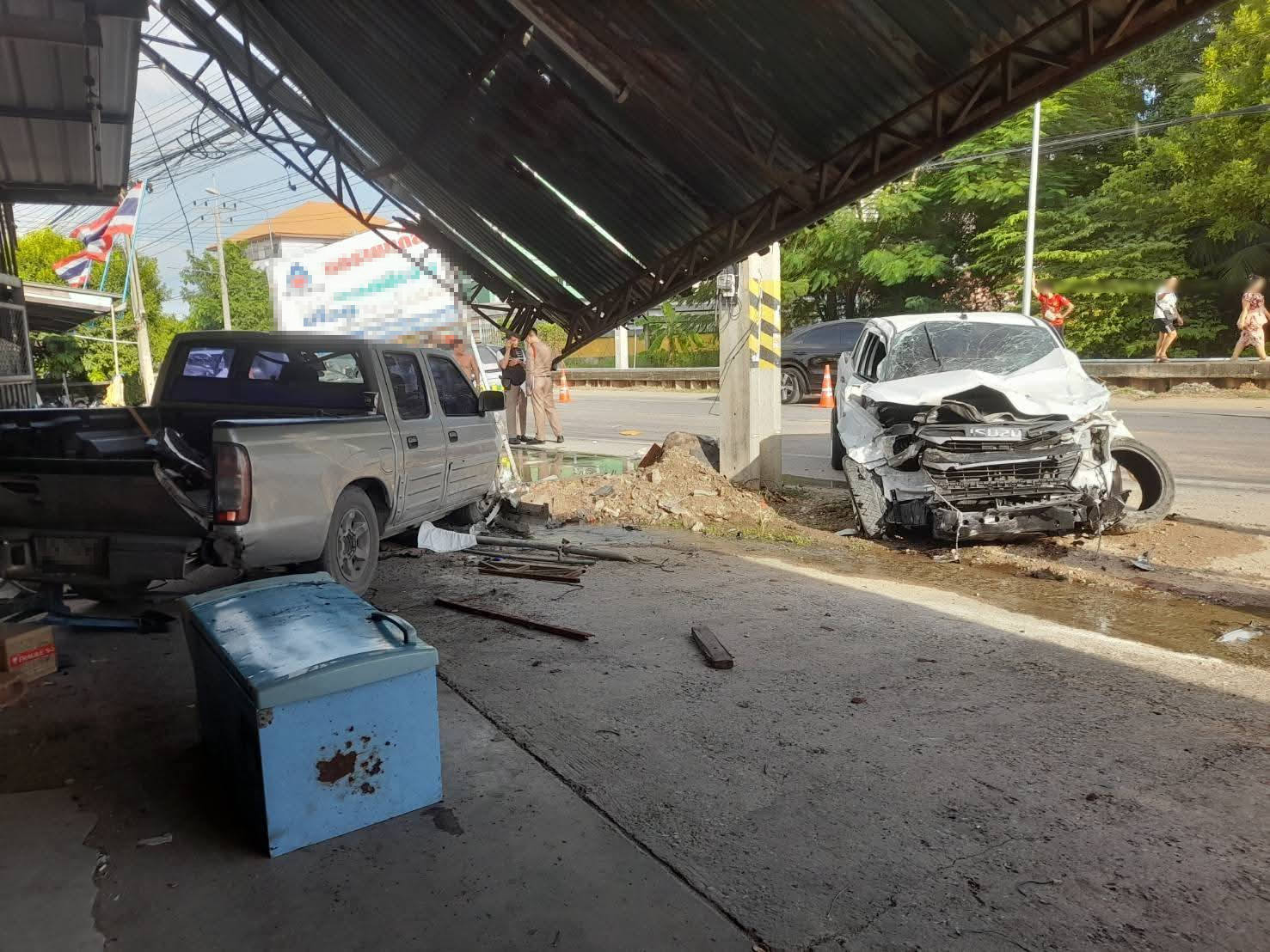 ใกล้กันพบรถยนต์กระบะยี่ห้อ อีซูซุ สีขาว ทะเบียน 4732 กรุงเทพมหานคร สภาพรถชนอัดติดกับเสาไฟฟ้าในลักษณะขวางถนน หน้ารถพังยับ ถุงลมนิรภัยหลุดออกมา ส่วนคนขับยังไม่ทราบชื่อ ได้รับบาดเจ็บถูกนำตัวส่งโรงพยาบาลไปก่อนแล้ว นอกจากนี้ยังมีผู้ได้รับบาดเจ็บอีก 3 คน เป็นคนในครอบครัวเดียวกันที่กำลังช่วยกันนั่งปลูกต้นไม้อยู่หน้าบ้าน ถูกแรงกระแทกจากรถอีกคันที่จอดอยู่ได้รับบาดเจ็บ และยังมีรถยนต์กระบะ นิสสัน ทะเบียน กรุงเทพมหานคร ที่จอดอยู่หน้าบ้านถูกชนอย่างแรงจนเสียหาย