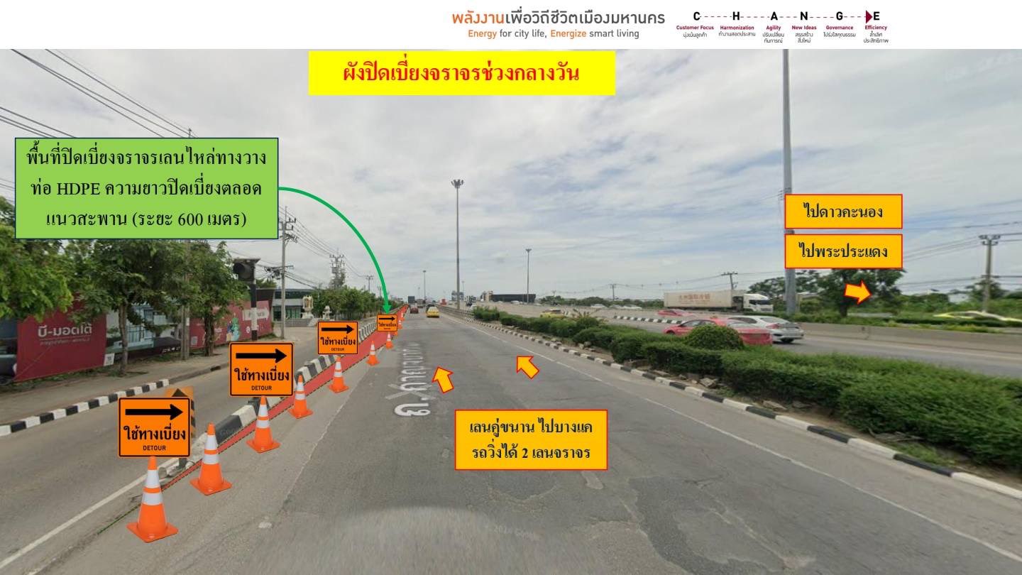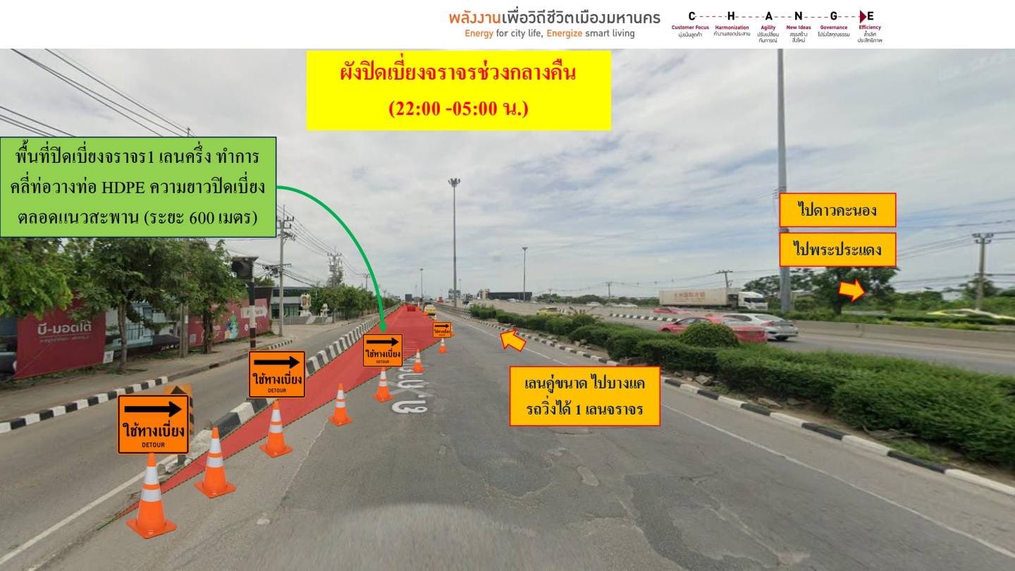 MEA ขยายเวลาปิดเบี่ยงจราจรเพื่อก่อสร้างบ่อพักและท่อร้อยสายไฟฟ้าใต้ดิน วันที่ 11 ส.ค. 68 (เริ่มปิด 21.00 น.) - 17 ส.ค.68 (10.00 น.) บริเวณทางแยกต่างระดับบางขุนเทียน-เอกชัย โดยปิดเวลา 21.00-05.00 น. (ปิดเบี่ยง 1ช่องทาง) และเวลา 05.00-21.00 น. ปิดช่องไหล่ทาง