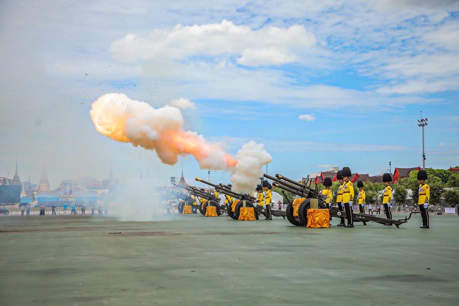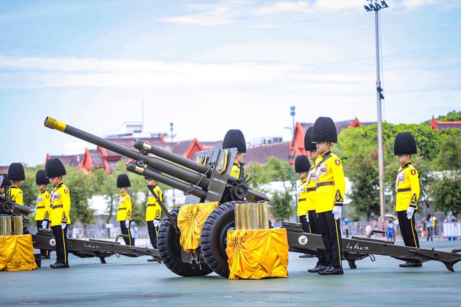 โดยกองร้อยปืนใหญ่ยิงสลุต ใช้ปืนใหญ่เบากระสุนวิถีราบ แบบ 80 ขนาด 75 มิลลิเมตร จำนวน 4 กระบอก ทำการยิงตามจังหวะของเพลงสรรเสริญพระบารมี จำนวน 21 นัด จังหวะ 5 วินาที ทีละกระบอก นับรอบจากขวาไปซ้าย ใช้เวลายิงทั้งหมด 1 นาที 40 วินาที ซึ่งจะดำเนินการยิงสลุตหลวง โดยพร้อมเพรียงกันทั้ง 3 เหล่าทัพ