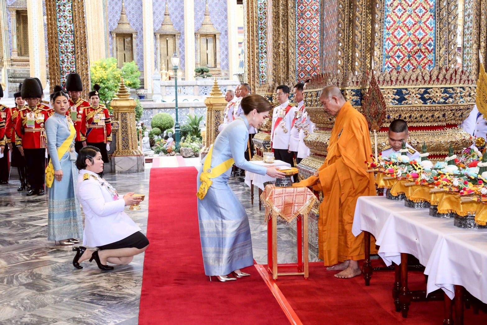 สมเด็จพระนางเจ้าฯ พระบรมราชินี เสด็จพระราชดำเนินไปทรงประเคนจตุปัจจัยไทยธรรมแด่ สมเด็จพระอริยวงศาคตญาณ สมเด็จพระสังฆราช สกลมหาสังฆปริณายก สมเด็จพระราชาคณะ แล้วทรงประเคนจตุปัจจัยไทยธรรมแด่ พระราชาคณะเจ้าคณะรอง และพระราชาคณะ จนครบ ๙๔ รูป เสร็จแล้ว ทรงหลั่งทักษิโณทก พระสงฆ์ถวายอนุโมทนา ถวายอดิเรก ถวายพระพรลา