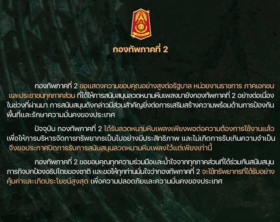 กองทัพภาคที่ 2 ขอขอบคุณทุกความร่วมมือและน้ำใจจากทุกภาคส่วนที่ได้ร่วมกันสนับสนุนภารกิจปกป้องอธิปไตยของชาติ และขอให้ทุกท่านมั่นใจว่ากองทัพภาคที่ 2 จะใช้ทรัพยากรที่ได้รับอย่างคุ้มค่าและเกิดประโยชน์สูงสุด เพื่อความปลอดภัยและความมั่นคงของประเทศ