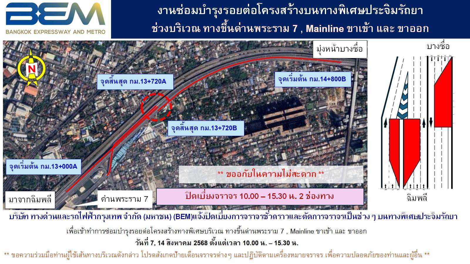 บริษัททางด่วนและรถไฟฟ้ากรุงเทพ จำกัดมหาชน (BEM) และ บมจ. ช.การช่าง จะเข้าดำเนินการ ซ่อมแซมและปรับปรุงรอยต่อโครงสร้างทางพิเศษ บริเวณก้างปลาทางขึ้นพระราม 7 ขาเข้า เวลา 10.00 น.-15.30 น.