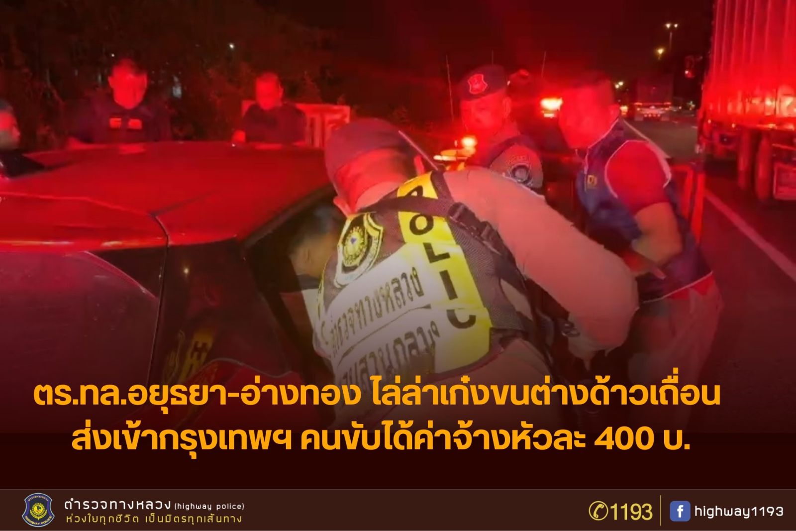 ตำรวจทางหลวงพระนครศรีอยุธยาและอ่างทองไล่ล่ารถเก๋ง 2 คัน หลังสืบทราบว่ามีการลักลอบขนแรงงานต่างด้าวเข้าเมืองผิดกฎหมาย พบรถต้องสงสัยวิ่งบนถนนสายเอเชียขาเข้า อ.เมืองอ่างทอง โดยรถติดฟิล์มทึบและขับตามกันมา 2 คัน ตำรวจส่งสัญญาณให้หยุด และสามารถสกัดได้ที่ ต.บ้านอิฐ อ.เมืองอ่างทอง เขตติดต่อ จ.พระนครศรีอยุธยา ตรวจพบชายอายุ 48 ปี เป็นคนขับ พร้อมแรงงานต่างด้าวชาย–หญิง 17 คน