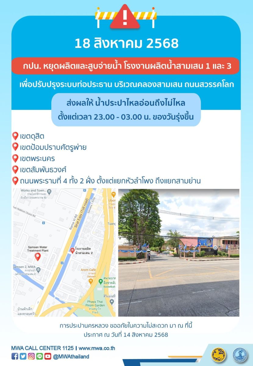 การประปานครหลวง (กปน.) ขอแจ้งให้ทราบว่า จะดำเนินการปรับปรุงระบบท่อประธาน ในพื้นที่บริเวณคลองสามเสน ถนนสวรรคโลก เพื่อให้ประชาชนได้รับบริการน้ำประปาอย่างเพียงพอและทั่วถึง จึงมีความจำเป็นต้องหยุดผลิตและสูบจ่ายน้ำ โรงงานผลิตน้ำสามเสน 1 และ 3 เป็นการชั่วคราว ในคืนวันจันทร์ที่ 18 สิงหาคม 2568 ตั้งแต่เวลา 23.00 - 03.00 น. ของวันรุ่งขึ้น โดยระหว่างดำเนินการ ส่งผลให้ น้ำประปาไหลอ่อนถึงไม่ไหล ในพื้นที่ดังต่อไปนี้