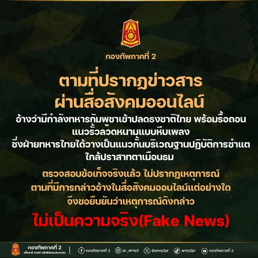15 สิงหาคม 25268 เพจ กองทัพภาคที่ 2 โพสต์ข้อความระบุ "ข่าวสื่อสังคมออนไลน์ อ้างว่ามีกำลังทหารกัมพูชาเข้าปลดธงชาติไทย พร้อมรื้อถอนแนวรั้วลวดหนามแบบหีบเพลง" ไม่เป็นความจริง(Fake News)