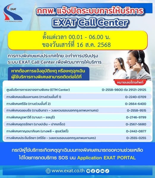 การทางพิเศษแห่งประเทศไทย (กทพ.) มีความจำเป็นจะต้องปิดระบบการให้บริการติดต่อกับเจ้าหน้าที่ของหมายเลขโทรศัพท์ 1543 (EXAT Call Center) เป็นการชั่วคราว