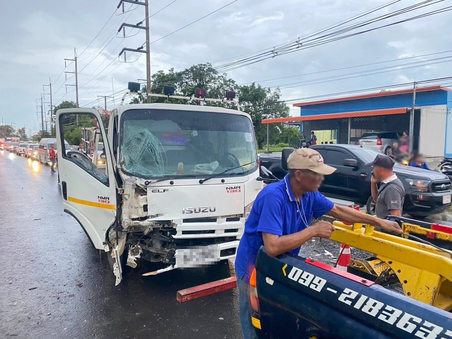 ที่เกิดเหตุ พบรถ 6 ล้อ อีซูซุ สีขาว ป้ายทะเบียน ศรีสะเกษ สภาพหน้ารถพังเสียหาย มีผู้บาดเจ็บเป็นคนขับ ได้ถูกนำตัวส่งโรงพยาบาลไปแล้ว