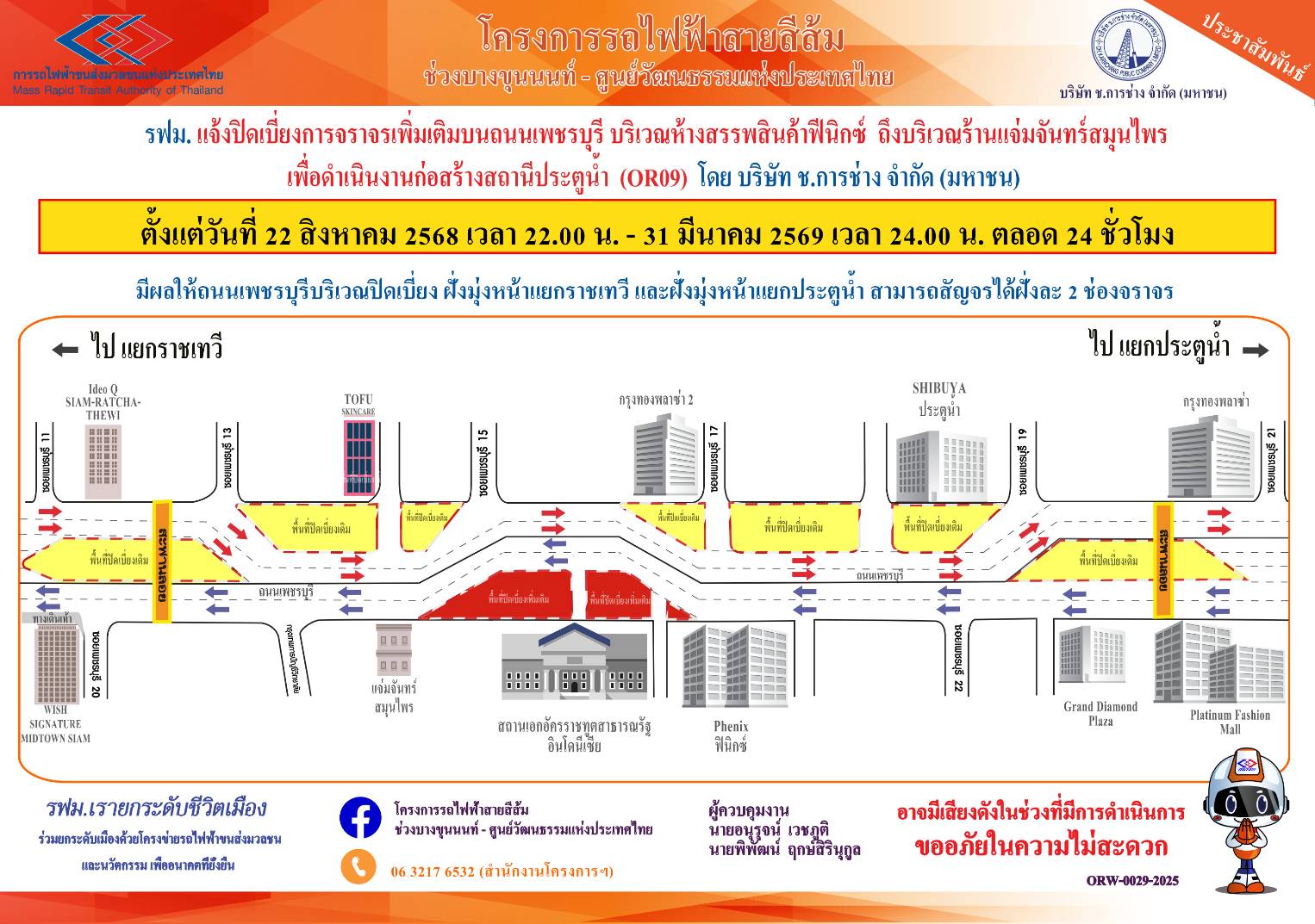 โครงการรถไฟฟ้าสายสีส้ม ช่วงบางขุนนนท์ – ศูนย์วัฒนธรรมแห่งประเทศไทย ปิดเบี่ยงการจราจรเพิ่มเติม 2 ช่องจราจร ชิดทางเท้า บนถนนเพชรบุรี ฝั่งมุ่งหน้าแยกราชเทวี บริเวณห้างสรรพสินค้าฟีนิกซ์ ถึงบริเวณร้านแจ่มจันทร์สมุนไพร เพื่อดำเนินการก่อสร้างสถานีประตูน้ำ (OR09) โครงการรถไฟฟ้าสายสีส้ม ช่วงบางขุนนนท์ - ศูนย์วัฒนธรรมแห่งประเทศไทย ตั้งแต่วันที่ 22 สิงหาคม 2568 (จากเดิมวันที่ 16 สิงหาคม 2568) เวลา 22.00 น. – 31 มีนาคม 2569 24.00 น. (ตลอด 24 ชั่วโมง)