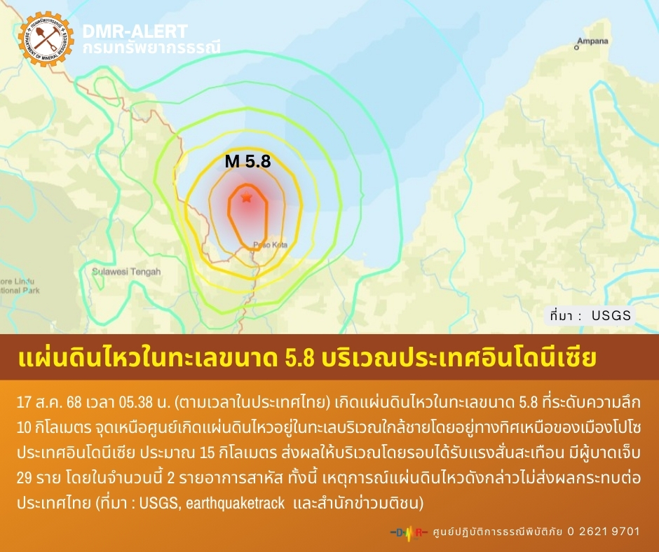 เพจ “ศูนย์ปฎิบัติการธรณีพิบัติภัย กรมทรัพยากรธรณี” รายงาน วันที่ 17 ส.ค. 68 เวลา 05.38 น. (ตามเวลาในประเทศไทย) เกิดแผ่นดินไหวในทะเลขนาด 5.8 ที่ระดับความลึก 10 กิโลเมตร จุดเหนือศูนย์เกิดแผ่นดินไหวอยู่ในทะเลบริเวณใกล้ชายโดยอยู่ทางทิศเหนือของเมืองโปโซ ประเทศอินโดนีเซีย ประมาณ 15 กิโลเมตร ส่งผลให้บริเวณโดยรอบได้รับแรงสั่นสะเทือน มีผู้บาดเจ็บ 29 ราย โดยในจำนวนนี้ 2 รายอาการสาหัส (ที่มา : USGS, earthquaketrack และสำนักข่าวมติชน)