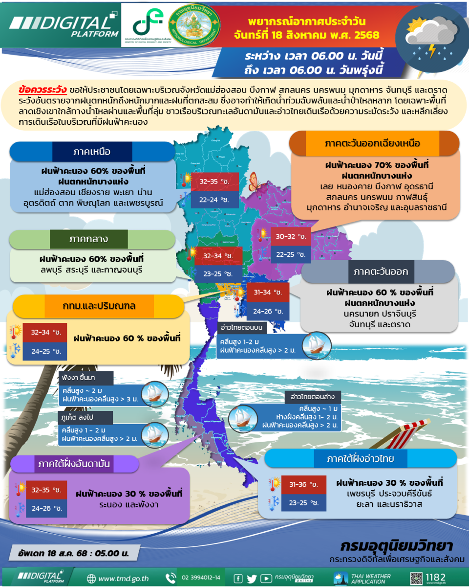 ลักษณะอากาศทั่วไป วันที่ 18 สิงหาคม 2568 พยากรณ์อากาศ 24 ชั่วโมงข้างหน้า ประเทศไทยมีฝนลดลง แต่ยังคงมีฝนตกหนักบางแห่งภาคเหนือ ภาคตะวันออกเฉียงเหนือ และภาคตะวันออก ขอให้ประชาชนโดยเฉพาะบริเวณจังหวัดแม่ฮ่องสอน บึงกาฬ สกลนคร นครพนม มุกดาหาร จันทบุรี และตราด ระวังอันตรายจากฝนตกหนักและฝนที่ตกสะสม ซึ่งอาจทำให้เกิดน้ำท่วมฉับพลันและน้ำป่าไหลหลาก โดยเฉพาะพื้นที่ลาดเชิงเขาใกล้ทางน้ำไหลผ่านและพื้นที่ลุ่ม เนื่องจากร่องมรสุมพาดผ่านภาคเหนือ และภาคตะวันออกเฉียงเหนือตอนบน เข้าสู่หย่อมความกดอากาศต่ำกำลังแรงบริเวณทะเลจีนใต้ตอนบน ประกอบกับมรสุมตะวันตกเฉียงใต้กำลังค่อนข้างแรงที่พัดปกคลุมทะเลอันดามัน ประเทศไทย และอ่าวไทยมีกำลังอ่อนลง
