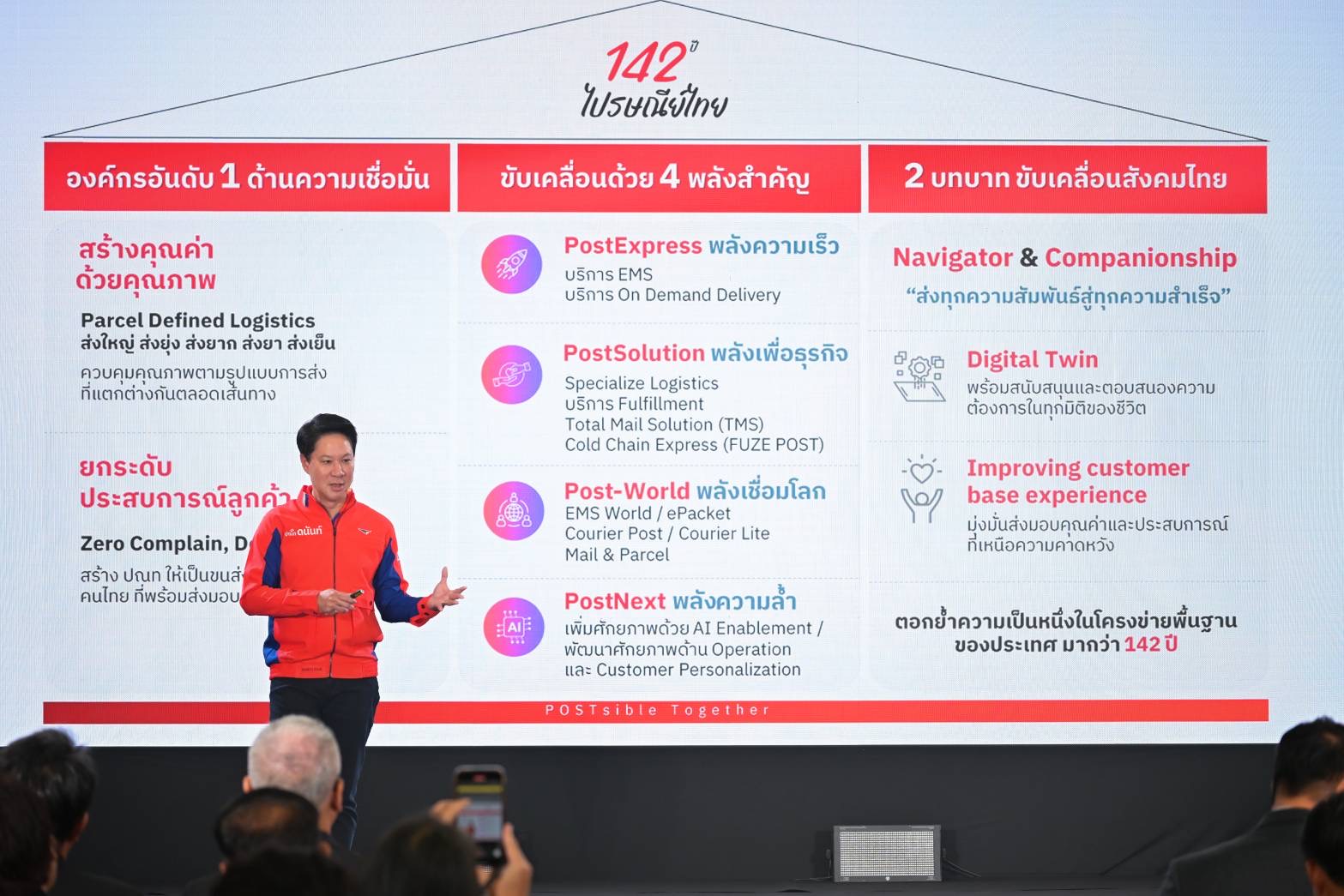 “นอกจากกลยุทธ์ “1-4-2” แล้ว ไปรษณีย์ไทยยังมุ่งสร้างความแตกต่างให้กับแบรนด์ที่เพิ่มมากขึ้น ซึ่งในช่วงครึ่งปีหลังนี้จะมีการสร้างการจดจำ และสร้างประสบการณ์ใหม่ทั้งในด้านสินค้า บริการ และไลฟ์สไตล์ ภายใต้แนวคิด “POSTsible Together เป็นไปรฯ ได้ ไปรฯ ด้วยกัน” อาทิ การเปิดตัว Super App แอปพลิเคชัน ที่รวบรวมบริการหลากหลายของไปรษณีย์ไทยไว้ในแพลตฟอร์มเดียว เพื่อให้ผู้ใช้สามารถติดตามพัสดุ สร้างใบจ่าหน้า เรียกรับพัสดุ ชำระค่าบริการ และเข้าถึงสิทธิประโยชน์ต่าง ๆ ได้อย่างครบวงจร พร้อมรองรับการเชื่อมต่อกับบริการภาครัฐและพันธมิตรภาคเอกชน มุ่งเสริมศักยภาพ SME ไทย ให้สามารถเติบโตอย่างยั่งยืน ซึ่งที่ผ่านมา ไปรษณีย์ไทยได้ร่วมกับแพลตฟอร์ม Amazon ในการส่งสินค้าจากผู้ประกอบไทยเข้าคลัง Amazon FBA (Fulfillment by Amazon) ซึ่งออกแบบมาสำหรับผู้ขายบน Amazon.com ที่ต้องการส่งสินค้าเข้าคลังในสหรัฐอเมริกา โดยไปรษณีย์ไทยเป็นผู้รวบรวมสินค้าในประเทศไทย ดำเนินพิธีการศุลกากร และส่งสินค้าสู่คลัง FBA เพื่อสนับสนุนผู้ค้ารายย่อยและ SME ไทยกระจายสินค้าสู่ตลาดอเมริกา