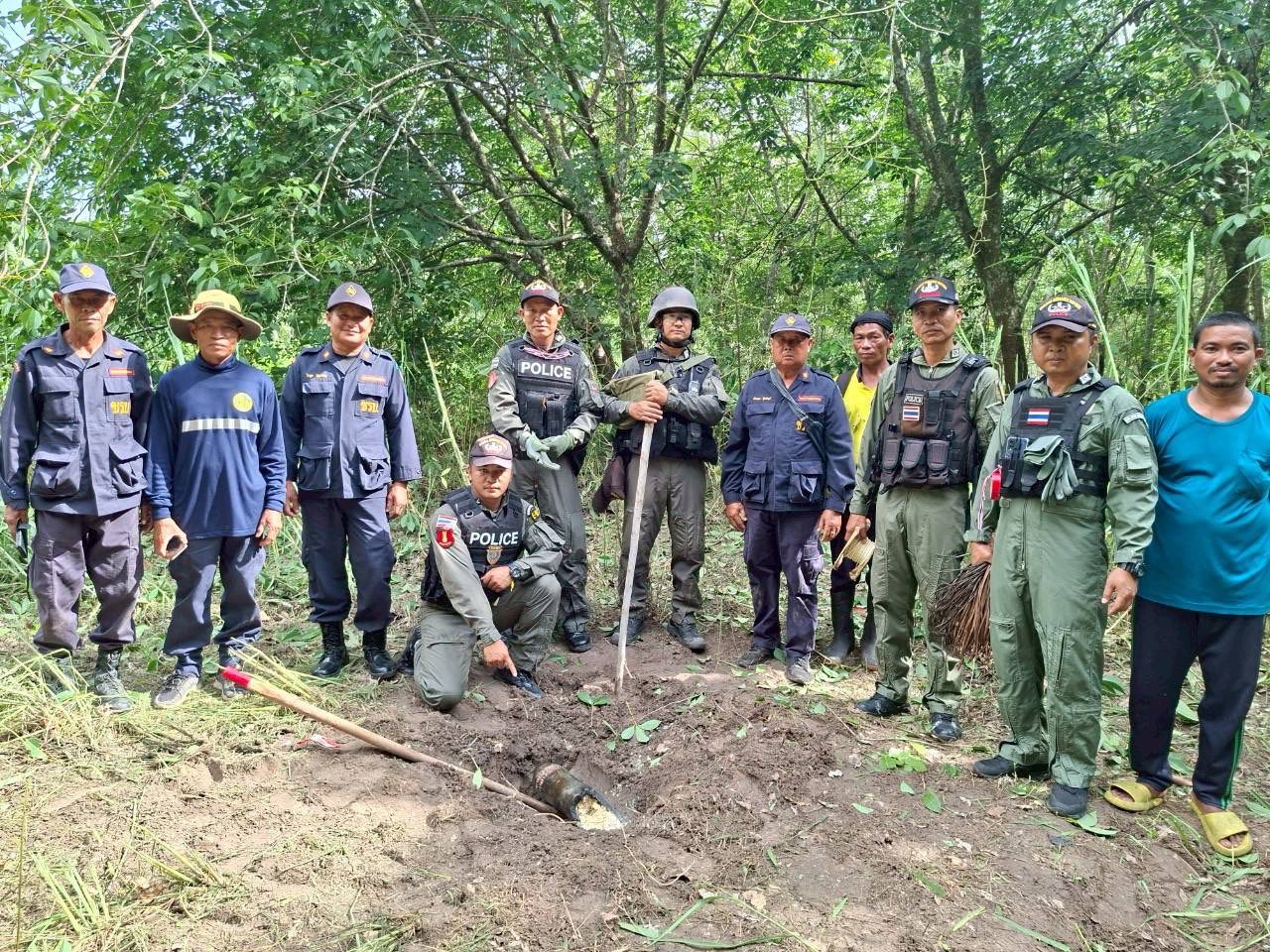 เวลา 14.45 น. (18 ส.ค.68) พล.ต.ต.พิษณุ วัตถุ ผบก.ภ.จว.ศรีสะเกษ , พ.ต.อ.สาธิต สถิตถาวร ผกก.สืบสวน ภ.จว.ศรีสะเกษ, พ.ต.ท.บรรชิด หวังแววกลางรอง ผกก.สืบสวน ภ.จว.ศรีสะเกษ , พ.ต.ท.เกรียงศักดิ์ ส่องแสงรอง ผกก.สืบสวน ภูธรจังหวัดศรีสะเกษ เจ้าหน้าที่เกี่ยวข้อง ชุดปฏิบัติการเก็บกู้และทำลายวัตถุระเบิด (EOD) กก.สืบสวน ภูธรจังหวัดศรีสะเกษ ร่วมกับ ชุด EOD กก.ตชด.22 ได้ร่วมกันตรวจสอบจุดกระสุนปืนใหญ่ตกไม่ทำงานตกค้างในพื้นที่บริเวณบ้านโศกขามป้อม ม.4 ต.ภูผาหมอก อ.กันทรลักษ์ ผลการปฏิบัติการทำลายสมบูรณ์พื้นที่ปลอดภัย