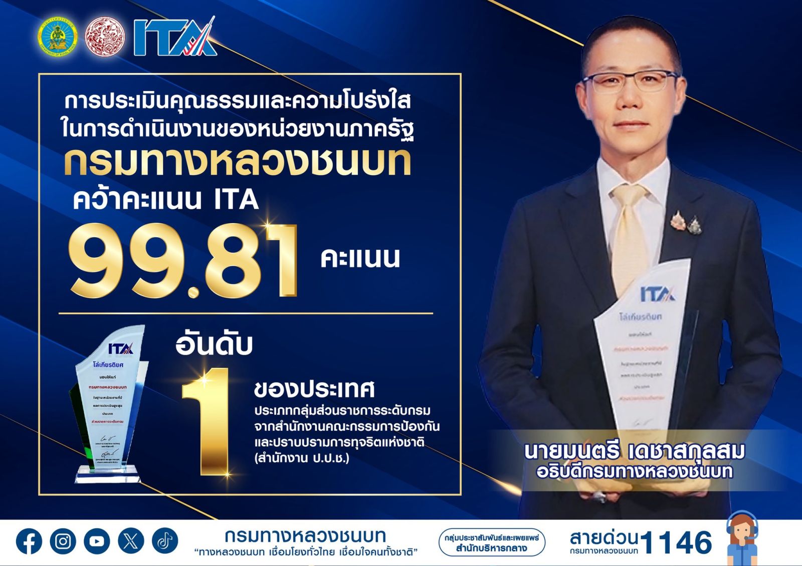 อธิบดีกรมทางหลวงชนบท กล่าวต่อไปว่า สำหรับการประเมินคุณธรรมและความโปร่งใสในการดำเนินงานของหน่วยงานภาครัฐ (Integrity and Transparency Assessment) หรือ ITA กรมทางหลวงชนบท (ทช.) ได้เข้าร่วมรับการประเมินตั้งแต่ปี 2559 ซึ่งมีผลการประเมินอยู่ทั้งในระดับผ่าน ผ่านดี และผ่านดีเยี่ยม โดยรักษามาตรฐานคะแนนประเมินสูงครอง 90 คะแนนขึ้นไป จำนวน 8 ปีซ้อน ตั้งแต่ปี 2561 จนถึงปี 2568 โดยครั้งล่าสุด ทช. ได้รับคะแนน 99.81 ซึ่งมีคะแนนที่เพิ่มสูงขึ้นมากถึง 12.81 คะแนน จากปี 2559 และเมื่อเปรียบเทียบกับปี 2567 ที่ผ่านมา มีคะแนนเพิ่มขึ้น 5.66 คะแนน จากลำดับที่ 27 ของประเทศ มาเป็นลำดับที่ 1 สูงสุดของประเทศในประเภทกลุ่มส่วนราชการระดับกรม ซึ่งแสดงถึงความมุ่งมั่นตั้งใจในการพัฒนาหน่วยงาน ให้เป็นหน่วยงานที่มีคุณธรรม และความโปร่งใส ผ่านกระบวนการติดตาม และตรวจสอบของประชาชนในทุกขั้นตอน อาทิ การนำประชาชนเข้ามามีส่วนร่วมในการดำเนินโครงการก่อสร้าง การรับฟังความคิดเห็นอย่างรอบด้าน เพื่อให้โครงการก่อสร้างเป็นไปเพื่อประโยชน์ และสอดคล้องกับความต้องการของประชาชนในพื้นที่อย่างสูงสุด การเข้าถึงข้อมูลข่าวสาร ผ่านการจัดตั้งศูนย์ราชการสะดวก (GECC) ตลอดจนสายด่วน ทช. 1146 ที่ให้บริการกับประชาชนสามารถติดต่อ ประสานงาน เพื่อสอบถามข้อมูลข่าวสาร รวมถึงแจ้งเหตุด่วนบนสายทางหลวงชนบทได้อย่างสะดวก รวดเร็ว