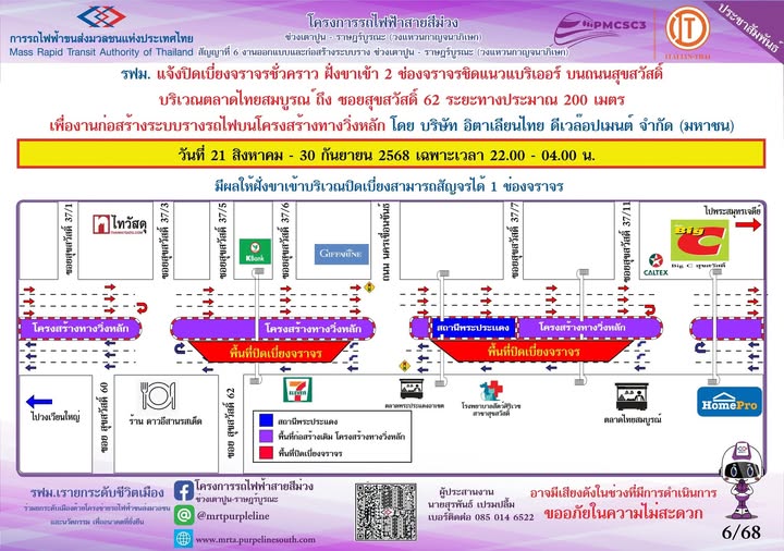 การรถไฟฟ้าขนส่งมวลชนแห่งประเทศไทย (รฟม.) แจ้งว่า บริษัท อิตาเลียนไทย ดีเวล๊อปเมนต์ จำกัด (มหาชน) ผู้รับจ้างงานออกแบบและก่อสร้างระบบรางตลอดแนวเส้นทางโครงการ โครงการรถไฟฟ้าสายสีม่วง ช่วงเตาปูน - ราษฎร์บูรณะ (วงแหวนกาญจนาภิเษก) สัญญาที่ 6 มีความจำเป็นต้องปิดเบี่ยงจราจรชั่วคราว ฝั่งขาเข้า 2 ช่องจราจรชิดแนวแบริเออร์ บนถนนสุขสวัสดิ์ บริเวณตลาดไทยสมบูรณ์ ถึง ซอยสุขสวัสดิ์ 62 ระยะทางประมาณ 200 เมตร เพื่องานก่อสร้างระบบรางรถไฟบนโครงสร้างทางวิ่งหลัก ระหว่างวันที่ 21 สิงหาคม - 30 กันยายน 2568 เฉพาะเวลา 22.00 - 04.00 น. มีผลให้ช่องจราจรฝั่งขาเข้าบริเวณปิดเบี่ยงสามารถสัญจรได้ 1 ช่องจราจร
