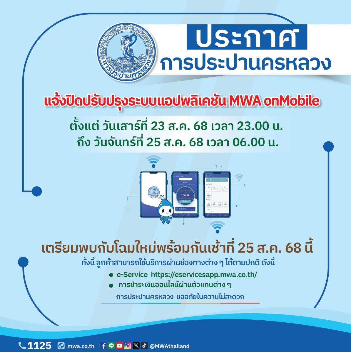 การประปานครหลวง (กปน.) จะปิดปรับปรุงระบบแอปพลิเคชัน MWA onMobile ชั่วคราว ตั้งแต่วันเสาร์ที่ 23 สิงหาคม 2568 เวลา 23.00 น. ถึงวันจันทร์ที่ 25 สิงหาคม 2568 เวลา 06.00 น. เพื่อเตรียมความพร้อมของแอปพลิเคชัน MWA onMobile โฉมใหม่ ซึ่่งจะเปิดให้อัพเดทพร้อมกันในช่วงเช้าของวันที่ 25 ส.ค. 68 นี้
