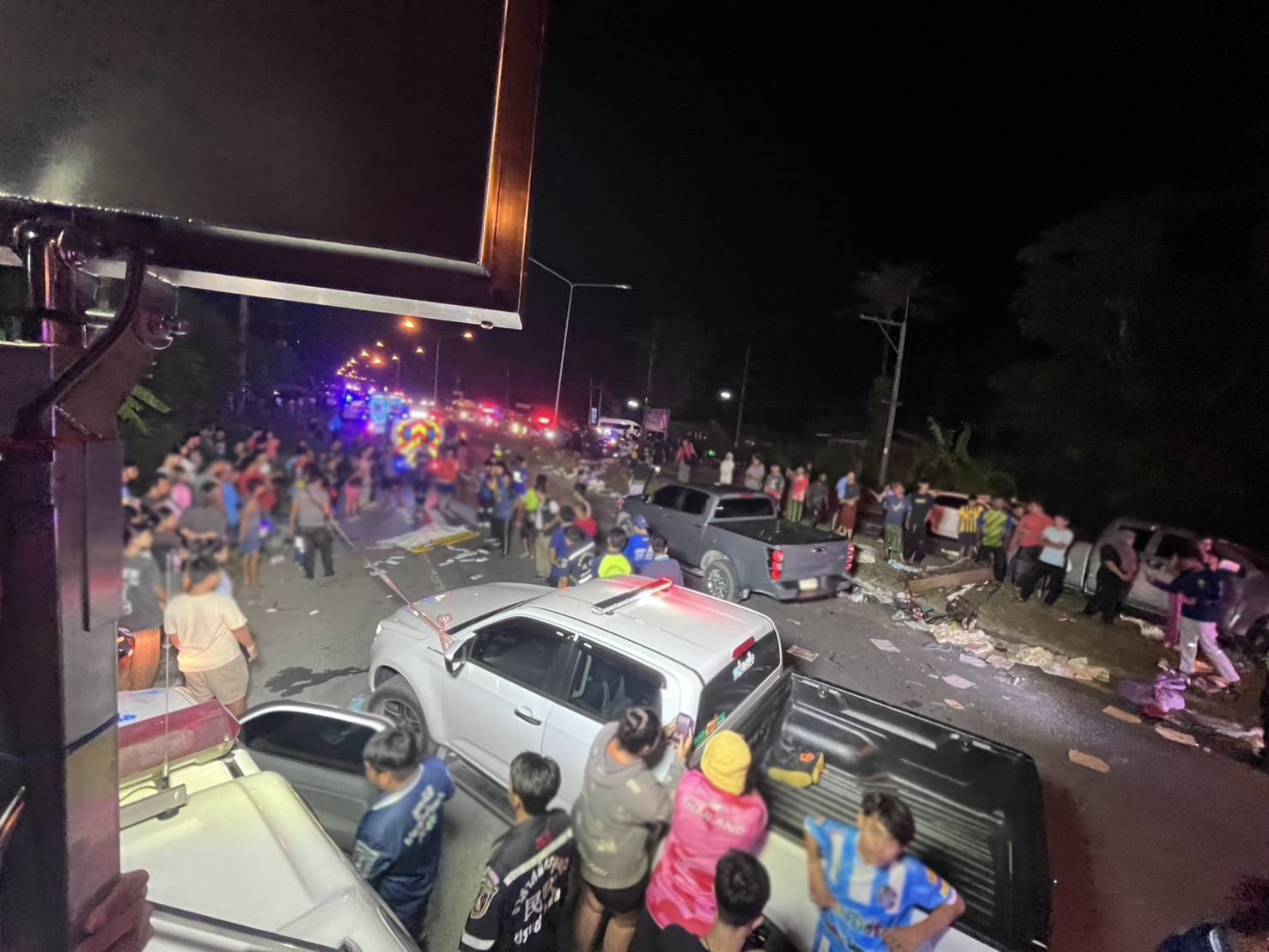ที่เกิดเหตุ พบรถกระบะ อีซูซุ สีเทา สภาพหน้ารถพังเสียหายอยู่บนเกาะกลาง, รถจักรยานยนต์พ่วงข้าง ไม่ทราบยี่ห้อ ป้ายทะเบียน นครศรีธรรมราช สภาพพังทั้งคันอยู่ในพงหญ้า และรถกระบะ อีซูซุ สีดำ สภาพพลิกตะแคงอยู่ข้างทาง