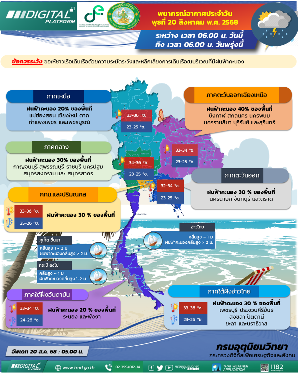 ลักษณะอากาศทั่วไป วันที่ 20 สิงหาคม 2568 พยากรณ์อากาศ 24 ชั่วโมงข้างหน้า ประเทศไทยมีฝนลดลง แต่ยังคงมีฟ้าคะนองบางแห่ง เนื่องจากมรสุมตะวันตกเฉียงใต้กำลังอ่อนพัดปกคลุมทะเลอันดามัน ประเทศไทย และอ่าวไทย ในขณะที่หย่อมความกดอากาศต่ำปกคลุมบริเวณประเทศเวียดนามตอนบน