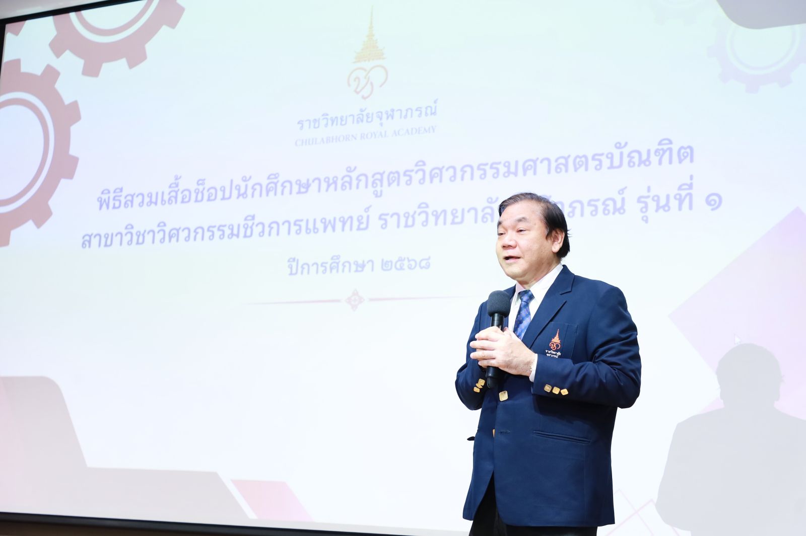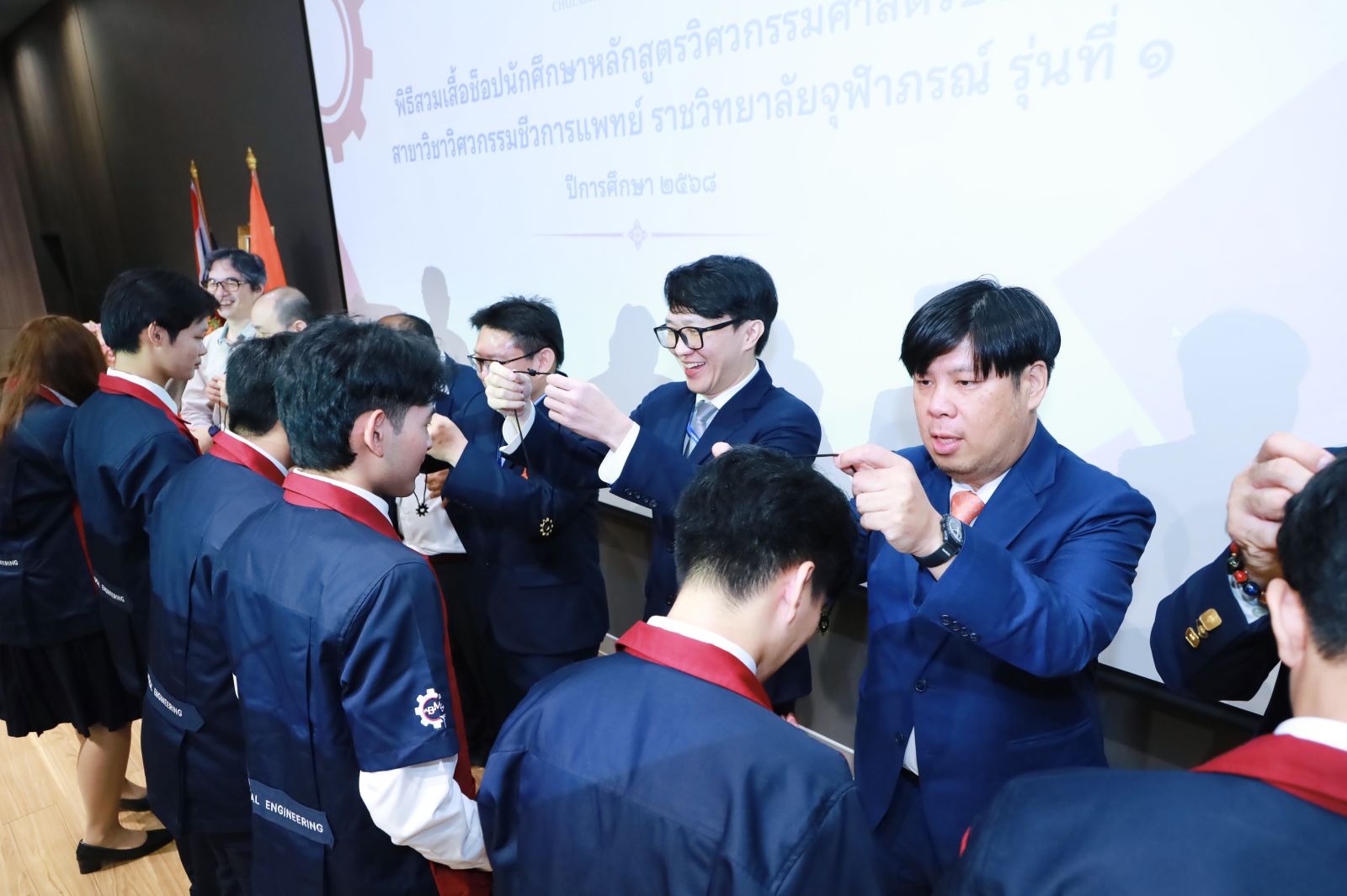 เมื่อวันที่ 7 สิงหาคม 2568 โครงการจัดตั้งคณะวิศวกรรมศาสตร์ ราชวิทยาลัยจุฬาภรณ์ จัด “พิธีสวมเสื้อช็อปของนักศึกษาหลักสูตรวิศวกรรมศาสตรบัณฑิต สาขาวิชาวิศวกรรมชีวการแพทย์” รุ่นที่ 1 ปีการศึกษา 2568 จำนวน 30 คน เพื่อเป็นสัญลักษณ์แห่งความมุ่งมั่นและความพร้อมของนักศึกษาในการก้าวสู่เส้นทางวิศวกรรมอย่างเต็มภาคภูมิ โดย รองศาสตราจารย์ นายสัตวแพทย์ ดร.จตุพร กระจายศรี รักษาการคณบดีคณะวิทยาศาสตร์ เป็นประธานในพิธีให้โอวาทและสวมเสื้อช็อปแก่นักศึกษา พร้อมด้วย ผู้ช่วยศาสตราจารย์ ดร.พรภพ นัยเนตร หัวหน้าโครงการจัดตั้งคณะวิศวกรรมศาสตร์ ราชวิทยาลัยจุฬาภรณ์ กล่าวแสดงความยินดีและเป็นกำลังใจให้นักศึกษาในการศึกษาเล่าเรียน ท่ามกลางบรรยากาศแห่งความภาคภูมิใจ โดยมีอาจารย์ประจำหลักสูตรวิศวกรรมชีวการแพทย์และอาจารย์พิเศษเป็นสักขีพยานในช่วงเวลาสำคัญนี้ ณ ห้องบรรยาย 3A-301 อาคารวิทยาลัยแพทยศาสตร์ศรีสวางควัฒน ราชวิทยาลัยจุฬาภรณ์ เขตหลักสี่ กรุงเทพมหานคร