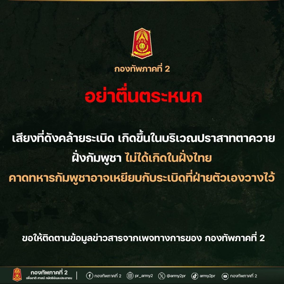และขอให้ติดตามข้อมูลข่าวสารจากช่องทางอย่างเป็นทางการของกองทัพภาคที่ 2 เพื่อป้องกันการสับสนและความเข้าใจผิด