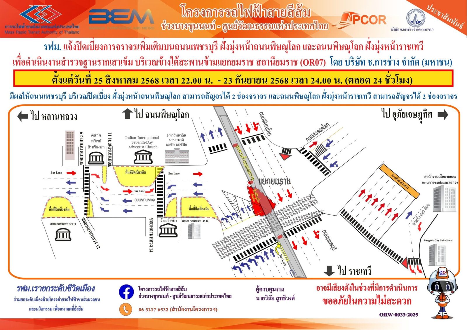 การรถไฟฟ้าขนส่งมวลชนแห่งประเทศไทย (รฟม.) แจ้งว่า บริษัท ช.การช่าง จำกัด (มหาชน) ผู้รับจ้างออกแบบและก่อสร้างอุโมงค์ทางวิ่งและสถานีใต้ดิน โครงการรถไฟฟ้าสายสีส้ม ช่วงบางขุนนนท์ - ศูนย์วัฒนธรรมแห่งประเทศไทย มีความจำเป็นต้องปิดเบี่ยงการจราจรเพิ่มเติมบนถนนเพชรบุรี ฝั่งมุ่งหน้าถนนพิษณุโลก จำนวน 1 ช่องจราจร และถนนพิษณุโลก ฝั่งมุ่งหน้าราชเทวี จำนวน 1 ช่องจราจร เพื่อดำเนินงานสำรวจรากเสาเข็ม บริเวณข้างใต้สะพานข้ามแยกยมราช สถานียมราช (OR07) ตั้งแต่วันที่ 25 สิงหาคม 2568 เวลา 22.00 น. – 23 กันยายน 2568 เวลา 24.00 น. (ตลอด 24 ชั่วโมง) มีรายละเอียดดังนี้