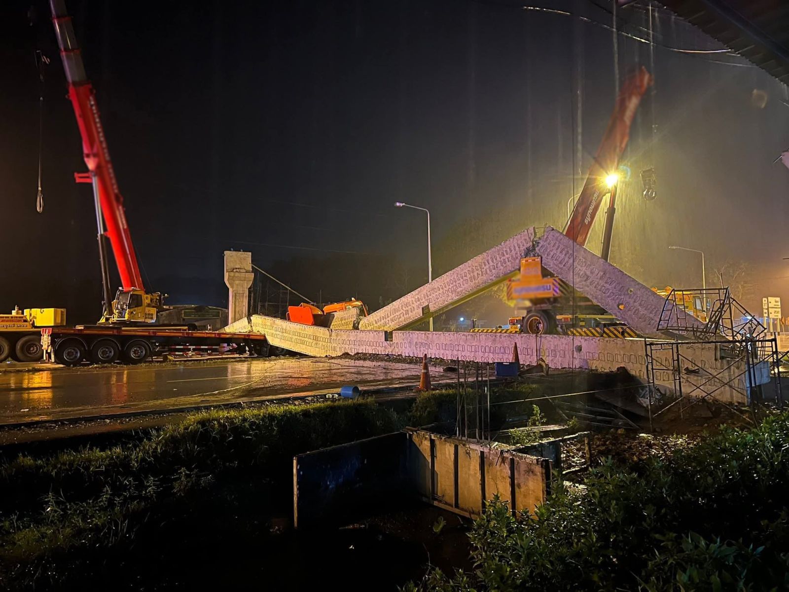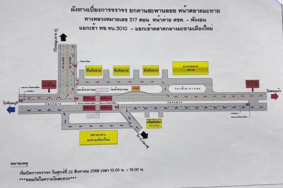 คานสะพานลอยคนข้าม ร่วงระหว่างก่อสร้าง ถนนหมายเลข 317 ใกล้เคียงทางเข้า ตลาดเทศบาลอำเภอมะขาม โชคดีไร้บาดเจ็บหรือเสียชีวิต จ.จันทบุรี