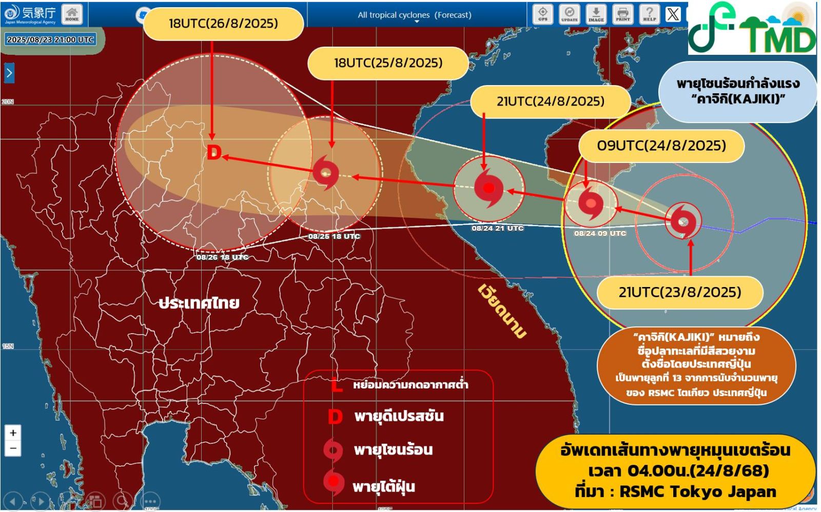 ประกาศ กรมอุตุนิยมวิทยา ฉบับที่ 8 “พายุคาจิกิ” และ ฝนตกหนักถึงหนักมาก บริเวณประเทศไทย เมื่อเวลา 07.00 น. ของวันนี้ (24 ส.ค. 68) พายุโซนร้อน กำลังแรง “คาจิกิ” บริเวณทะเลจีนใต้ตอนบน ได้ทวีกำลังแรงขึ้นเป็น พายุไต้ฝุ่น แล้ว และเมื่อเวลา 10.00 น. มีศูนย์กลางอยู่ห่างประมาณ 550 กิโลเมตร ทางทิศตะวันออกเฉียงใต้ของเมืองวิญ ประเทศเวียดนาม หรือที่ละติจูด 17.3 องศาเหนือ ลองจิจูด 110.7 องศาตะวันออก ความเร็วลมสูงสุดใกล้ศูนย์กลางประมาณ 140 กิโลเมตรต่อชั่วโมง