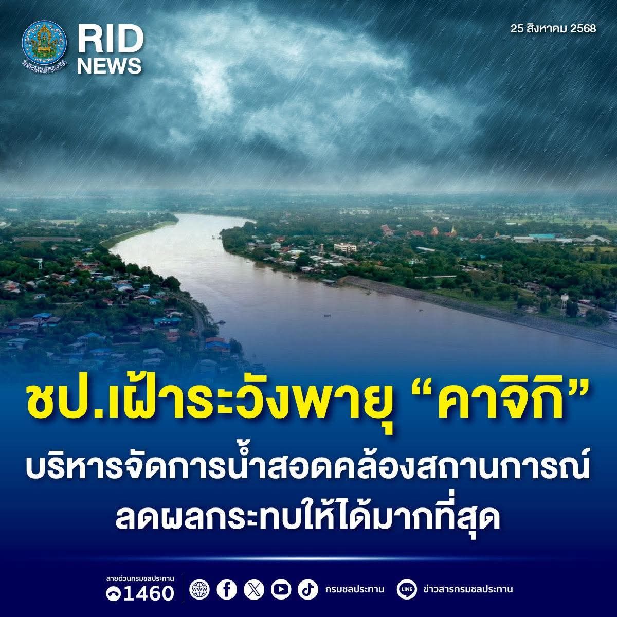 กรมชลประทาน เปิดเผยว่า จากสถานการณ์พายุ “คาจิกิ” (KAJIKI) บริเวณทะเลจีนใต้ตอนบน มีแนวโน้มจะเคลื่อนขึ้นฝั่งบริเวณประเทศเวียดนามตอนบน และจะอ่อนกำลังลงเป็นพายุโซนร้อนในวันนี้(25 ส.ค. 68) หลังจากนั้นจะอ่อนกำลังลงเป็นพายุดีเปรสชันเคลื่อนเข้าสู่ประเทศลาวในช่วงเช้าวันที่ 26 ส.ค. 68 พายุนี้มีแนวโน้มที่จะอ่อนกำลังลงเป็นหย่อมความกดอากาศต่ำกำลังแรงและเคลื่อนเข้าสู่ประเทศไทยบริเวณจังหวัดน่านในช่วงเย็นของวันที่ 26 ส.ค. 68 ทำให้ประเทศไทยมีฝนตกหนักถึงหนักมากหลายพื้นที่ กับมีลมแรงบริเวณภาคตะวันออกเฉียงเหนือตอนบน และภาคเหนือ ในช่วงวันที่ 25–27 ส.ค. 68 ซึ่งจะส่งผลให้มีปริมาณน้ำจากทางตอนบนไหลลงสู่ลุ่มน้ำเจ้าพระยาเพิ่มมากขึ้น