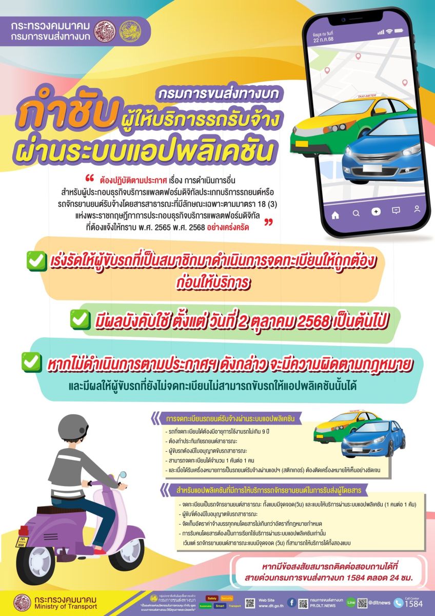 คณะกรรมการธุรกรรมทางอิเล็กทรอนิกส์ได้ออกประกาศ เรื่อง การดำเนินการอื่นสำหรับผู้ประกอบธุรกิจบริการแพลตฟอร์มดิจิทัล ประเภทบริการรถยนต์หรือรถจักรยานยนต์รับจ้างโดยสารสาธารณะที่มีลักษณะเฉพาะตามมาตรา 18 (3) แห่งพระราชกฤษฎีกาการประกอบธุรกิจบริการแพลตฟอร์มดิจิทัลที่ต้องแจ้งให้ทราบ พ.ศ. 2565 พ.ศ. 2568 เพื่อกำกับดูแลการดำเนินงานของผู้ให้บริการรถยนต์ผ่านแอปพลิเคชัน ให้เป็นไปด้วยความเรียบร้อยและถูกต้องตามกฎหมาย กรมการขนส่งทางบกในฐานะหน่วยงานที่เกี่ยวข้องกำชับให้แอปพลิเคชันผู้ให้บริการรถยนต์หรือรถจักรยานยนต์รับจ้างต้องปฏิบัติตามประกาศ ฯ อย่างเคร่งครัด