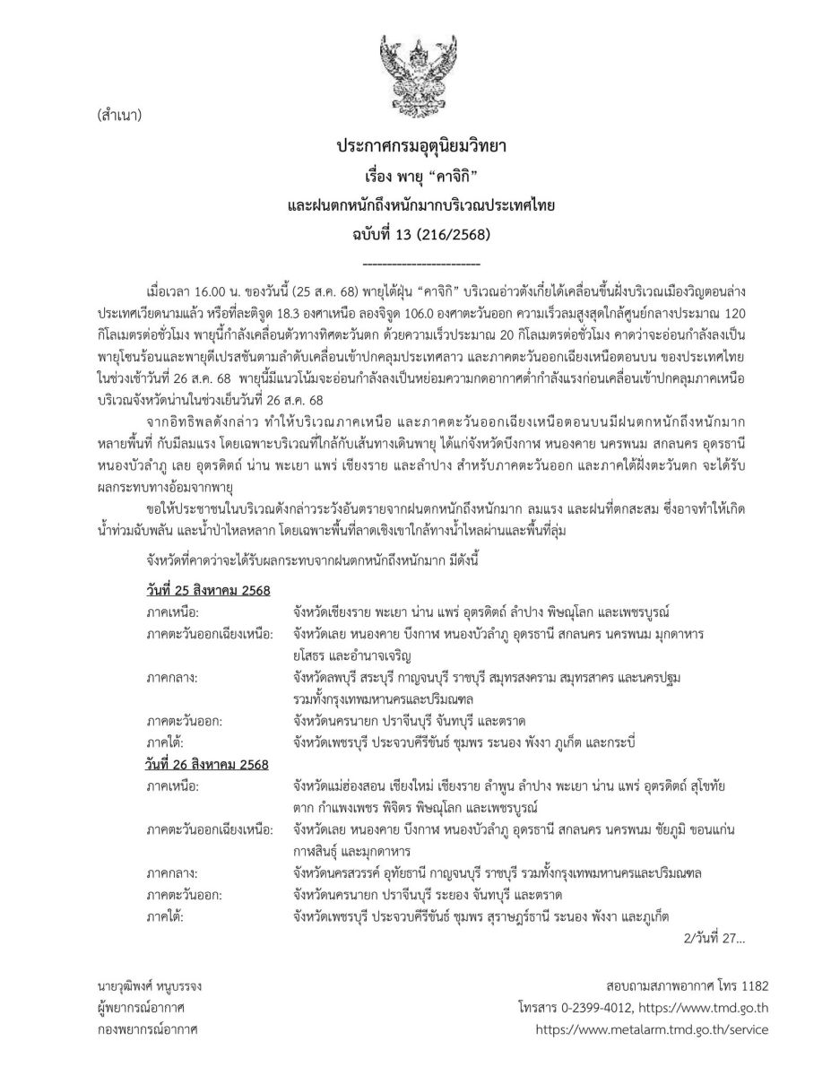 กรมอุตุนิยมวิทยา ออกประกาศเรื่อง พายุ “คาจิกิ” และฝนตกหนักถึงหนักมากบริเวณประเทศไทย ฉบับที่ 13 (216/2568) ระบุว่า