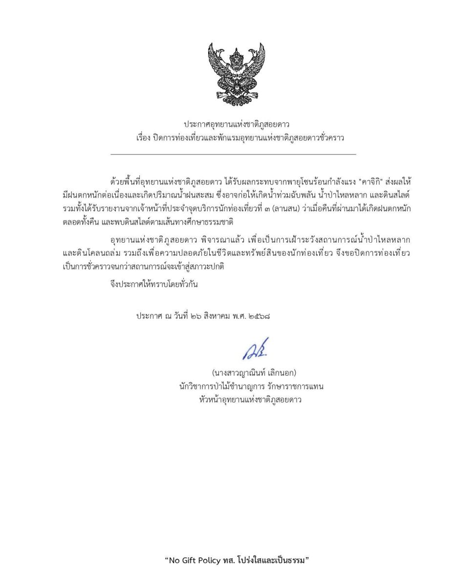 อุทยานแห่งชาติภูสอยดาว พิจารณาแล้ว เพื่อเป็นการเฝ้าระวังสถานการณ์น้ำป่าไหลหลากและดินโคลนถล่ม รวมถึงเพื่อความปลอดภัยในชีวิตและทรัพยืสินของนักท่องเที่ยว จึงขอปิดการท่องเที่ยวเป็นการชั่วคราว จนกว่าสถานการณ์จะเข้าสู่สภาวะสู่ปกติ