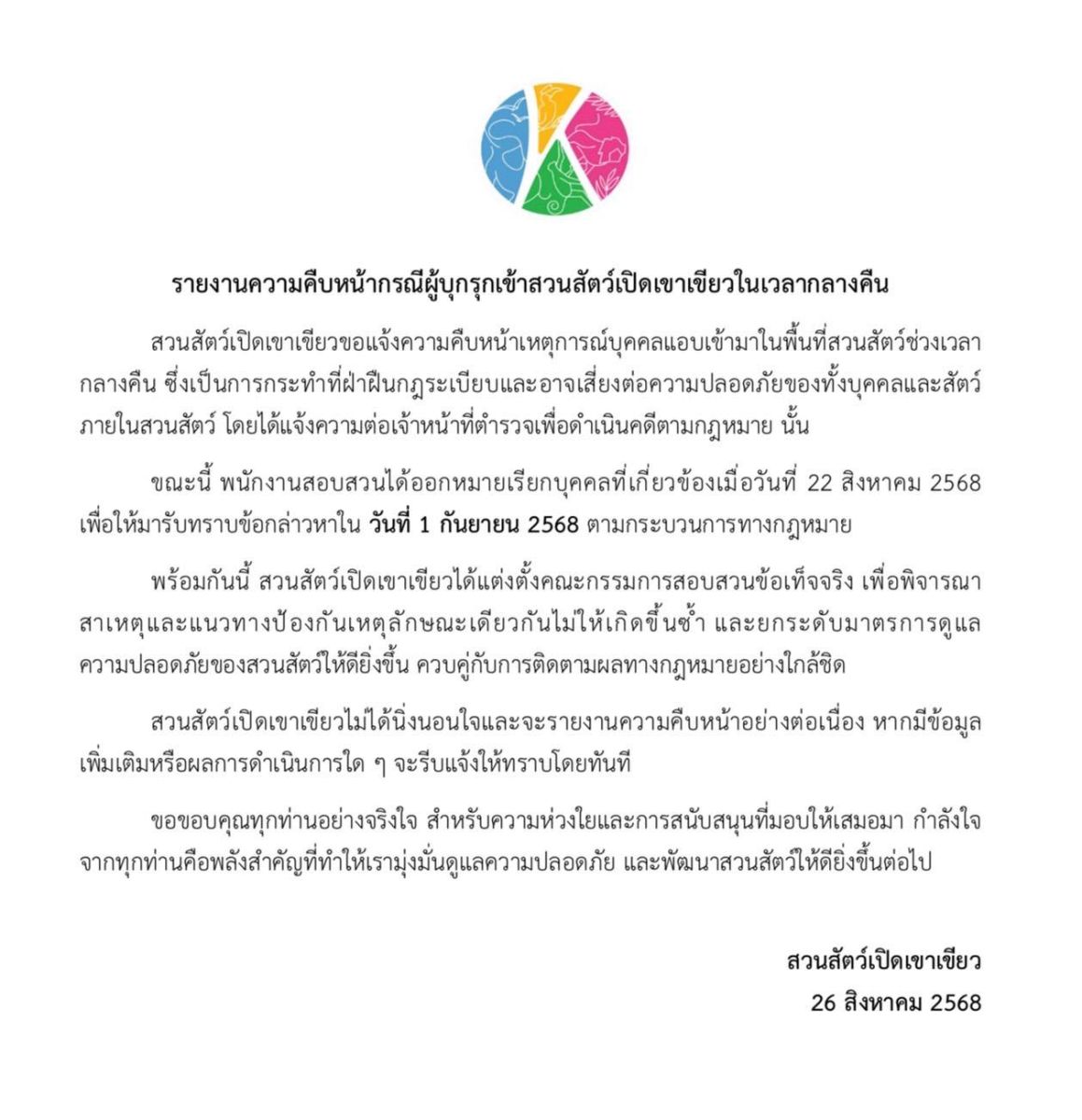 26 สิงหาคม 2568 เพจ สวนสัตว์เปิดเขาเขียว รายงานความคืบหน้ากรณีผู้บุกรุกเข้าสวนสัตว์เปิดเขาเขียวในเวลากลางคืน รายละเอียดระบุว่า สวนสัตว์เปิดเขาเขียวขอแจ้งความคืบหน้าเหตุการณ์บุคคลแอบเข้ามาในพื้นที่สวนสัตว์ช่วงเวลากลางคืน ซึ่งเป็นการกระทำที่ฝ่าฝืนกฎระเบียบและอาจเสี่ยงต่อความปลอดภัยของทั้งบุคคลและสัตว์ภายในสวนสัตว์ โดยได้แจ้งความต่อเจ้าหน้าที่ตำรวจเพื่อดำเนินคดีตามกฎหมาย นั้น