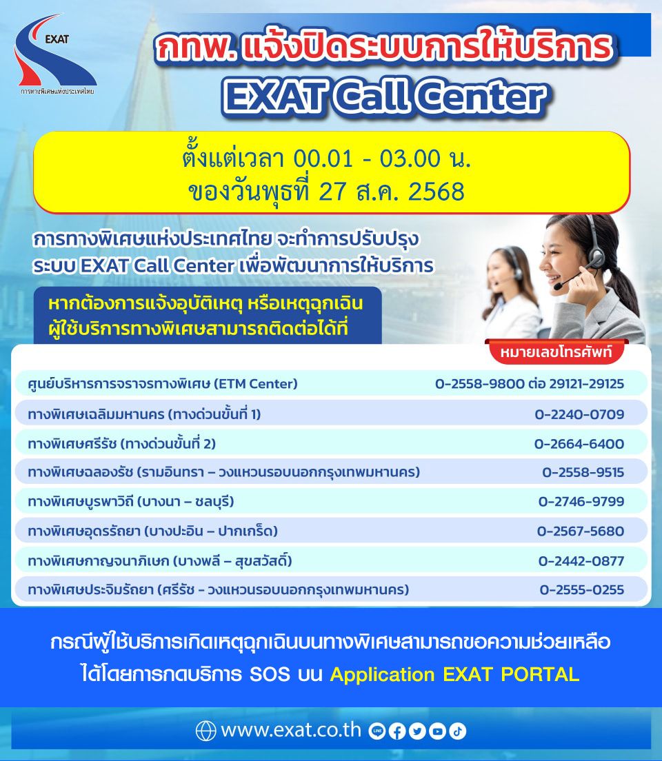การทางพิเศษแห่งประเทศไทย (กทพ.) แจ้งปิดให้บริการ EXAT Call Center ชั่วคราว เพื่อปรับปรุงระบบและพัฒนาการให้บริการ ในวันที่ 27 สิงหาคม 2568 เวลา 00.01 – 03.00 น.