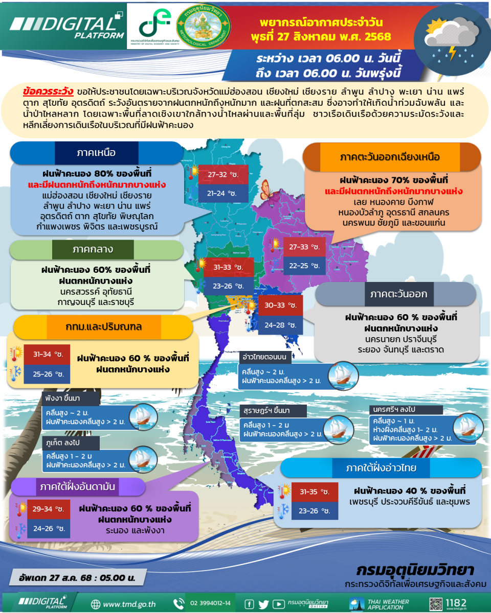 ลักษณะอากาศทั่วไป วันที่ 27 สิงหาคม 2568 พยากรณ์อากาศ 24 ชั่วโมงข้างหน้า บริเวณภาคเหนือ ภาคตะวันออกเฉียงเหนือตอนบน มีฝนตกหนักถึงหนักมากบางพื้นที่ ส่วนภาคกลางรวมทั้งกรุงเทพมหานครและปริมณฑล ภาคตะวันออก และภาคใต้มีฝนตกหนักบางแห่ง ขอให้ประชาชนโดยเฉพาะบริเวณจังหวัดแม่ฮ่องสอน เชียงใหม่ เชียงราย ลำพูน ลำปาง พะเยา น่าน แพร่ ตาก สุโขทัย อุตรดิตถ์ ระวังอันตรายจากฝนตกหนักถึงหนักมาก และฝนที่ตกสะสม ซึ่งอาจทำให้เกิดน้ำท่วมฉับพลัน และน้ำป่าไหลหลาก โดยเฉพาะพื้นที่ลาดเชิงเขาใกล้ทางน้ำไหลผ่านและพื้นที่ลุ่ม เนื่องจากร่องมรสุมพาดผ่านประเทศเมียนมาเข้าสู่หย่อมความกดอากาศต่ำบริเวณภาคเหนือ ประกอบกับมรสุมตะวันตกเฉียงใต้กำลังปานกลางพัดปกคลุมทะเลอันดามัน ประเทศไทย และอ่าวไทย