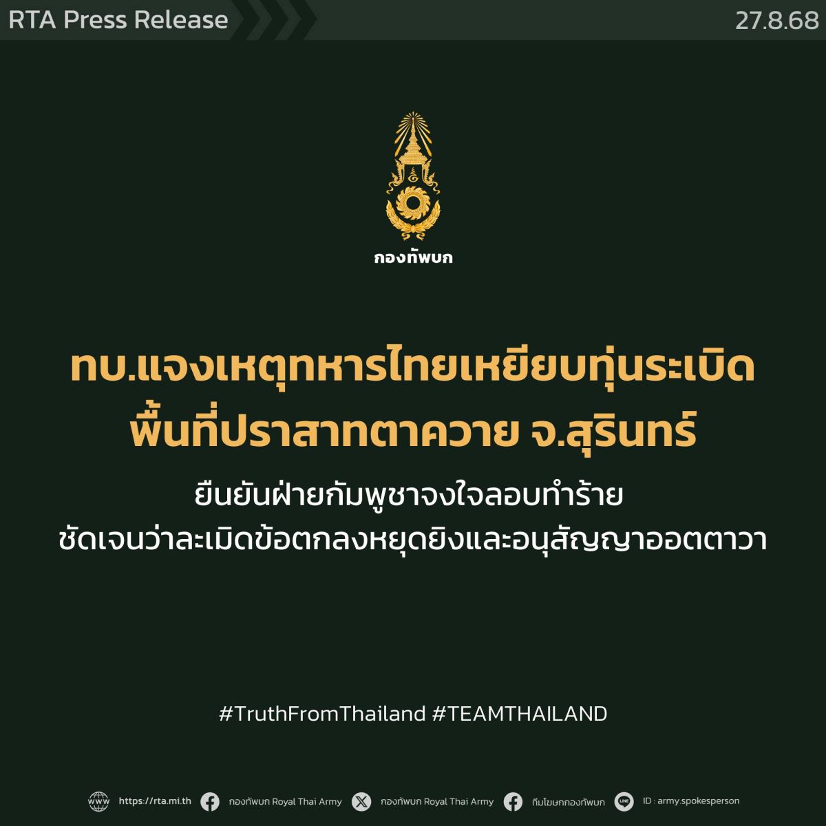 พลตรี วินธัย สุวารี โฆษกกองทัพบก กล่าวถึงเหตุการณ์เมื่อวันนี้ (27 สิงหาคม 2568)