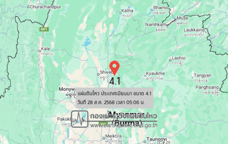 วันที่ 28 ส.ค. 2568 เวลา 05.06 น. กองเฝ้าระวังแผ่นดินไหว กรมอุตุนิยมวิทยา แจ้งเหตุ แผ่นดินไหว ขนาด 4.1 ความลึก 10 กม. ภายในพื้นที่ของประเทศเมียนมา(22.54°N,96.17°E) ศูนย์กลางห่างออกไปทางทิศตะวันตกเฉียงเหนือของ อ.ปางมะผ้า จ.แม่ฮ่องสอน ประมาณ 399 กม. ยังไม่มีรายงานผลกระทบต่อประเทศไทย